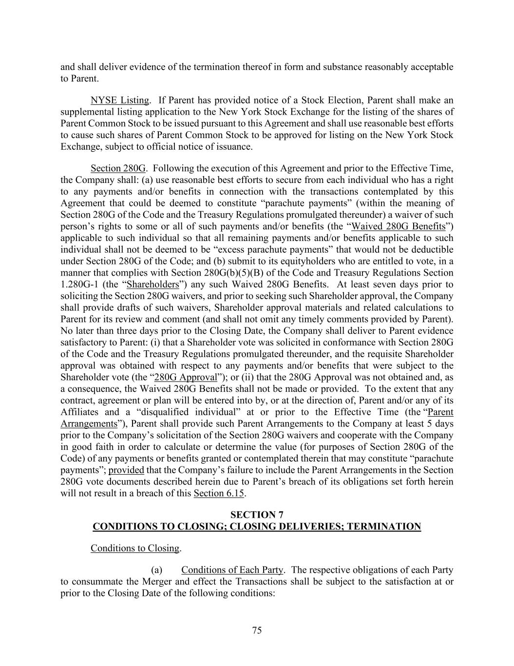 75 and shall deliver evidence of the termination thereof in form and substance reasonably acceptable to Parent. NYSE Listing. If Parent has provided notice of a Stock Election, Parent shall make an supplemental listing application to the New York Stock Exchange for the listing of the shares of Parent Common Stock to be issued pursuant to this Agreement and shall use reasonable best efforts to cause such shares of Parent Common Stock to be approved for listing on the New York Stock Exchange, subject to official notice of issuance. Section 280G. Following the execution of this Agreement and prior to the Effective Time, the Company shall: (a) use reasonable best efforts to secure from each individual who has a right to any payments and/or benefits in connection with the transactions contemplated by this Agreement that could be deemed to constitute “parachute payments” (within the meaning of Section 280G of the Code and the Treasury Regulations promulgated thereunder) a waiver of such person’s rights to some or all of such payments and/or benefits (the “Waived 280G Benefits”) applicable to such individual so that all remaining payments and/or benefits applicable to such individual shall not be deemed to be “excess parachute payments” that would not be deductible under Section 280G of the Code; and (b) submit to its equityholders who are entitled to vote, in a manner that complies with Section 280G(b)(5)(B) of the Code and Treasury Regulations Section 1.280G-1 (the “Shareholders”) any such Waived 280G Benefits. At least seven days prior to soliciting the Section 280G waivers, and prior to seeking such Shareholder approval, the Company shall provide drafts of such waivers, Shareholder approval materials and related calculations to Parent for its review and comment (and shall not omit any timely comments provided by Parent). No later than three days prior to the Closing Date, the Company shall deliver to Parent evidence satisfactory to Parent: (i) that a Shareholder vote was solicited in conformance with Section 280G of the Code and the Treasury Regulations promulgated thereunder, and the requisite Shareholder approval was obtained with respect to any payments and/or benefits that were subject to the Shareholder vote (the “280G Approval”); or (ii) that the 280G Approval was not obtained and, as a consequence, the Waived 280G Benefits shall not be made or provided. To the extent that any contract, agreement or plan will be entered into by, or at the direction of, Parent and/or any of its Affiliates and a “disqualified individual” at or prior to the Effective Time (the “Parent Arrangements”), Parent shall provide such Parent Arrangements to the Company at least 5 days prior to the Company’s solicitation of the Section 280G waivers and cooperate with the Company in good faith in order to calculate or determine the value (for purposes of Section 280G of the Code) of any payments or benefits granted or contemplated therein that may constitute “parachute payments”; provided that the Company’s failure to include the Parent Arrangements in the Section 280G vote documents described herein due to Parent’s breach of its obligations set forth herein will not result in a breach of this Section 6.15. SECTION 7 CONDITIONS TO CLOSING; CLOSING DELIVERIES; TERMINATION Conditions to Closing. (a) Conditions of Each Party. The respective obligations of each Party to consummate the Merger and effect the Transactions shall be subject to the satisfaction at or prior to the Closing Date of the following conditions: