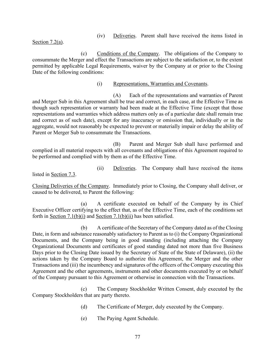 77 (iv) Deliveries. Parent shall have received the items listed in Section 7.2(a). (c) Conditions of the Company. The obligations of the Company to consummate the Merger and effect the Transactions are subject to the satisfaction or, to the extent permitted by applicable Legal Requirements, waiver by the Company at or prior to the Closing Date of the following conditions: (i) Representations, Warranties and Covenants. (A) Each of the representations and warranties of Parent and Merger Sub in this Agreement shall be true and correct, in each case, at the Effective Time as though such representation or warranty had been made at the Effective Time (except that those representations and warranties which address matters only as of a particular date shall remain true and correct as of such date), except for any inaccuracy or omission that, individually or in the aggregate, would not reasonably be expected to prevent or materially impair or delay the ability of Parent or Merger Sub to consummate the Transactions. (B) Parent and Merger Sub shall have performed and complied in all material respects with all covenants and obligations of this Agreement required to be performed and complied with by them as of the Effective Time. (ii) Deliveries. The Company shall have received the items listed in Section 7.3. Closing Deliveries of the Company. Immediately prior to Closing, the Company shall deliver, or caused to be delivered, to Parent the following: (a) A certificate executed on behalf of the Company by its Chief Executive Officer certifying to the effect that, as of the Effective Time, each of the conditions set forth in Section 7.1(b)(i) and Section 7.1(b)(ii) has been satisfied. (b) A certificate of the Secretary of the Company dated as of the Closing Date, in form and substance reasonably satisfactory to Parent as to (i) the Company Organizational Documents, and the Company being in good standing (including attaching the Company Organizational Documents and certificates of good standing dated not more than five Business Days prior to the Closing Date issued by the Secretary of State of the State of Delaware), (ii) the actions taken by the Company Board to authorize this Agreement, the Merger and the other Transactions and (iii) the incumbency and signatures of the officers of the Company executing this Agreement and the other agreements, instruments and other documents executed by or on behalf of the Company pursuant to this Agreement or otherwise in connection with the Transactions. (c) The Company Stockholder Written Consent, duly executed by the Company Stockholders that are party thereto. (d) The Certificate of Merger, duly executed by the Company. (e) The Paying Agent Schedule.