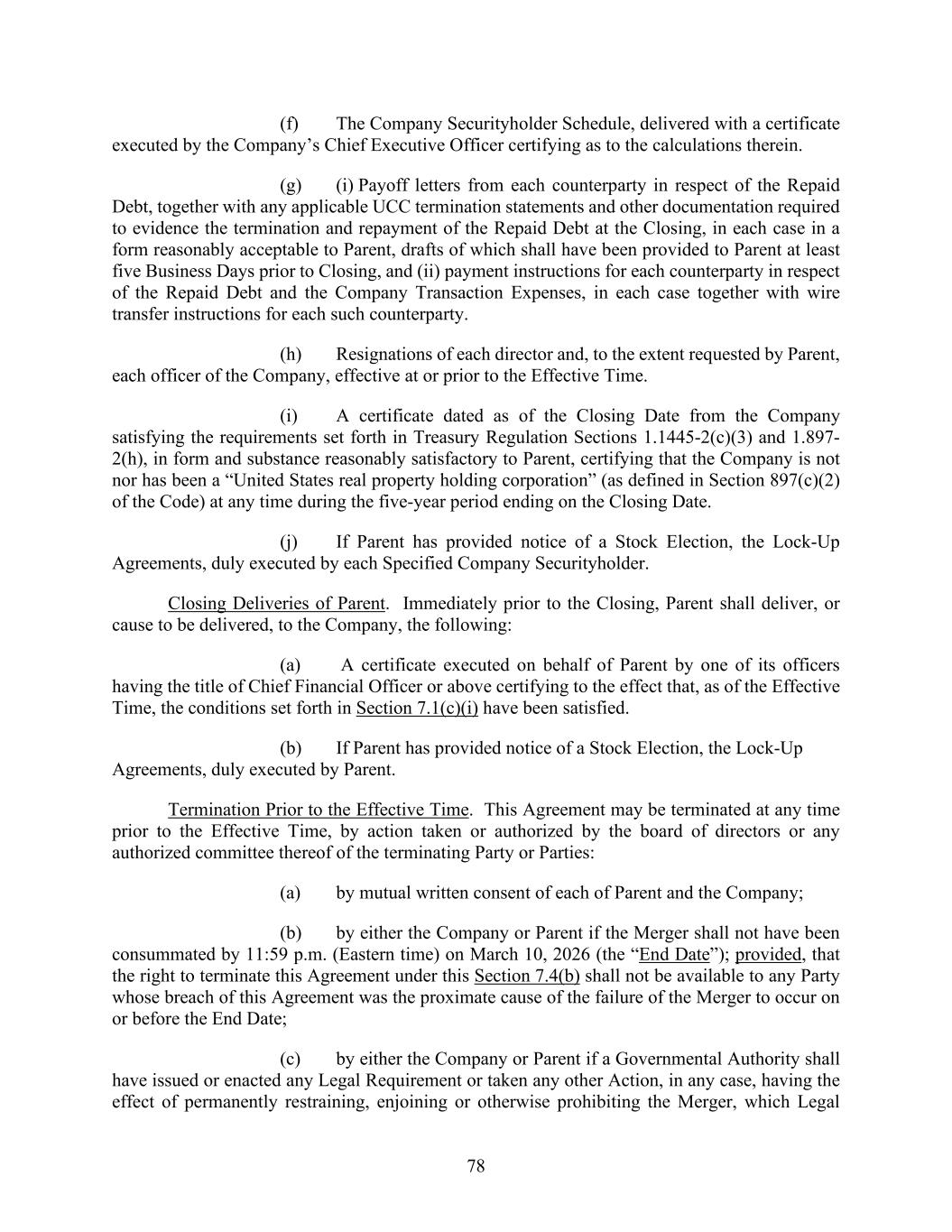 78 (f) The Company Securityholder Schedule, delivered with a certificate executed by the Company’s Chief Executive Officer certifying as to the calculations therein. (g) (i) Payoff letters from each counterparty in respect of the Repaid Debt, together with any applicable UCC termination statements and other documentation required to evidence the termination and repayment of the Repaid Debt at the Closing, in each case in a form reasonably acceptable to Parent, drafts of which shall have been provided to Parent at least five Business Days prior to Closing, and (ii) payment instructions for each counterparty in respect of the Repaid Debt and the Company Transaction Expenses, in each case together with wire transfer instructions for each such counterparty. (h) Resignations of each director and, to the extent requested by Parent, each officer of the Company, effective at or prior to the Effective Time. (i) A certificate dated as of the Closing Date from the Company satisfying the requirements set forth in Treasury Regulation Sections 1.1445-2(c)(3) and 1.897- 2(h), in form and substance reasonably satisfactory to Parent, certifying that the Company is not nor has been a “United States real property holding corporation” (as defined in Section 897(c)(2) of the Code) at any time during the five-year period ending on the Closing Date. (j) If Parent has provided notice of a Stock Election, the Lock-Up Agreements, duly executed by each Specified Company Securityholder. Closing Deliveries of Parent. Immediately prior to the Closing, Parent shall deliver, or cause to be delivered, to the Company, the following: (a) A certificate executed on behalf of Parent by one of its officers having the title of Chief Financial Officer or above certifying to the effect that, as of the Effective Time, the conditions set forth in Section 7.1(c)(i) have been satisfied. (b) If Parent has provided notice of a Stock Election, the Lock-Up Agreements, duly executed by Parent. Termination Prior to the Effective Time. This Agreement may be terminated at any time prior to the Effective Time, by action taken or authorized by the board of directors or any authorized committee thereof of the terminating Party or Parties: (a) by mutual written consent of each of Parent and the Company; (b) by either the Company or Parent if the Merger shall not have been consummated by 11:59 p.m. (Eastern time) on March 10, 2026 (the “End Date”); provided, that the right to terminate this Agreement under this Section 7.4(b) shall not be available to any Party whose breach of this Agreement was the proximate cause of the failure of the Merger to occur on or before the End Date; (c) by either the Company or Parent if a Governmental Authority shall have issued or enacted any Legal Requirement or taken any other Action, in any case, having the effect of permanently restraining, enjoining or otherwise prohibiting the Merger, which Legal