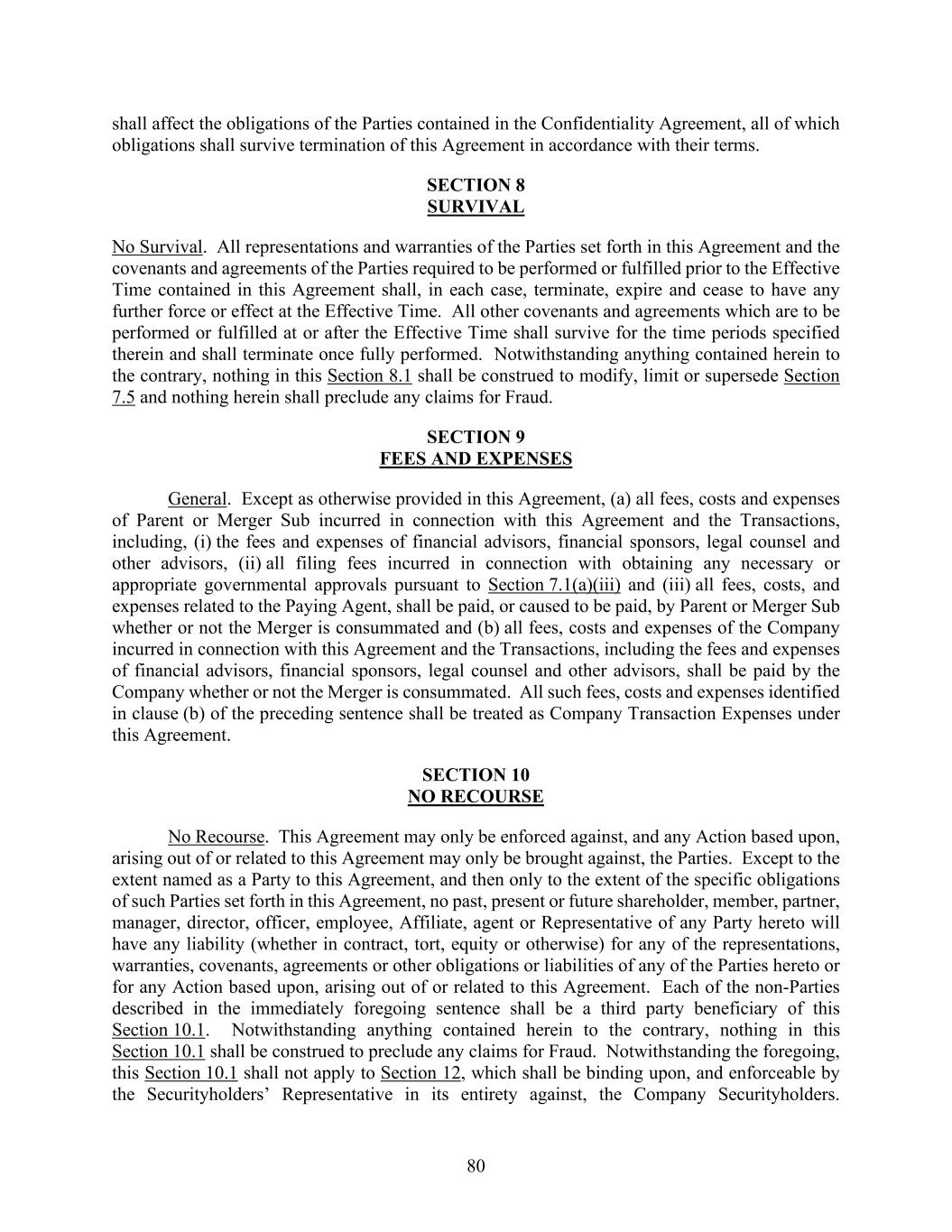 80 shall affect the obligations of the Parties contained in the Confidentiality Agreement, all of which obligations shall survive termination of this Agreement in accordance with their terms. SECTION 8 SURVIVAL No Survival. All representations and warranties of the Parties set forth in this Agreement and the covenants and agreements of the Parties required to be performed or fulfilled prior to the Effective Time contained in this Agreement shall, in each case, terminate, expire and cease to have any further force or effect at the Effective Time. All other covenants and agreements which are to be performed or fulfilled at or after the Effective Time shall survive for the time periods specified therein and shall terminate once fully performed. Notwithstanding anything contained herein to the contrary, nothing in this Section 8.1 shall be construed to modify, limit or supersede Section 7.5 and nothing herein shall preclude any claims for Fraud. SECTION 9 FEES AND EXPENSES General. Except as otherwise provided in this Agreement, (a) all fees, costs and expenses of Parent or Merger Sub incurred in connection with this Agreement and the Transactions, including, (i) the fees and expenses of financial advisors, financial sponsors, legal counsel and other advisors, (ii) all filing fees incurred in connection with obtaining any necessary or appropriate governmental approvals pursuant to Section 7.1(a)(iii) and (iii) all fees, costs, and expenses related to the Paying Agent, shall be paid, or caused to be paid, by Parent or Merger Sub whether or not the Merger is consummated and (b) all fees, costs and expenses of the Company incurred in connection with this Agreement and the Transactions, including the fees and expenses of financial advisors, financial sponsors, legal counsel and other advisors, shall be paid by the Company whether or not the Merger is consummated. All such fees, costs and expenses identified in clause (b) of the preceding sentence shall be treated as Company Transaction Expenses under this Agreement. SECTION 10 NO RECOURSE No Recourse. This Agreement may only be enforced against, and any Action based upon, arising out of or related to this Agreement may only be brought against, the Parties. Except to the extent named as a Party to this Agreement, and then only to the extent of the specific obligations of such Parties set forth in this Agreement, no past, present or future shareholder, member, partner, manager, director, officer, employee, Affiliate, agent or Representative of any Party hereto will have any liability (whether in contract, tort, equity or otherwise) for any of the representations, warranties, covenants, agreements or other obligations or liabilities of any of the Parties hereto or for any Action based upon, arising out of or related to this Agreement. Each of the non-Parties described in the immediately foregoing sentence shall be a third party beneficiary of this Section 10.1. Notwithstanding anything contained herein to the contrary, nothing in this Section 10.1 shall be construed to preclude any claims for Fraud. Notwithstanding the foregoing, this Section 10.1 shall not apply to Section 12, which shall be binding upon, and enforceable by the Securityholders’ Representative in its entirety against, the Company Securityholders.