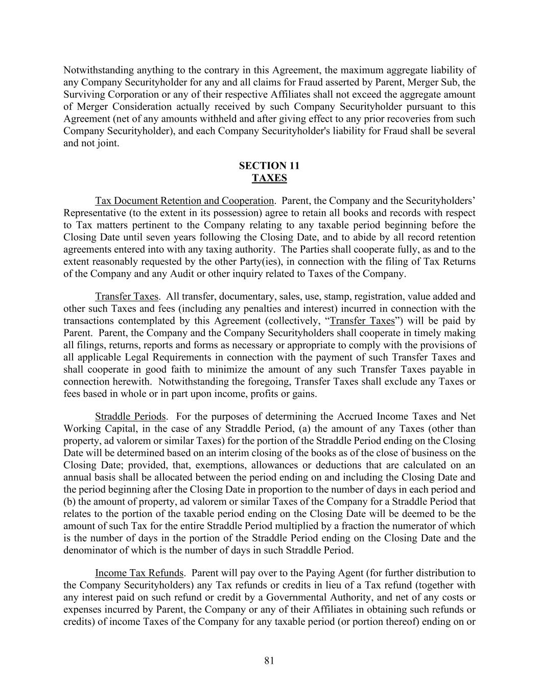 81 Notwithstanding anything to the contrary in this Agreement, the maximum aggregate liability of any Company Securityholder for any and all claims for Fraud asserted by Parent, Merger Sub, the Surviving Corporation or any of their respective Affiliates shall not exceed the aggregate amount of Merger Consideration actually received by such Company Securityholder pursuant to this Agreement (net of any amounts withheld and after giving effect to any prior recoveries from such Company Securityholder), and each Company Securityholder's liability for Fraud shall be several and not joint. SECTION 11 TAXES Tax Document Retention and Cooperation. Parent, the Company and the Securityholders’ Representative (to the extent in its possession) agree to retain all books and records with respect to Tax matters pertinent to the Company relating to any taxable period beginning before the Closing Date until seven years following the Closing Date, and to abide by all record retention agreements entered into with any taxing authority. The Parties shall cooperate fully, as and to the extent reasonably requested by the other Party(ies), in connection with the filing of Tax Returns of the Company and any Audit or other inquiry related to Taxes of the Company. Transfer Taxes. All transfer, documentary, sales, use, stamp, registration, value added and other such Taxes and fees (including any penalties and interest) incurred in connection with the transactions contemplated by this Agreement (collectively, “Transfer Taxes”) will be paid by Parent. Parent, the Company and the Company Securityholders shall cooperate in timely making all filings, returns, reports and forms as necessary or appropriate to comply with the provisions of all applicable Legal Requirements in connection with the payment of such Transfer Taxes and shall cooperate in good faith to minimize the amount of any such Transfer Taxes payable in connection herewith. Notwithstanding the foregoing, Transfer Taxes shall exclude any Taxes or fees based in whole or in part upon income, profits or gains. Straddle Periods. For the purposes of determining the Accrued Income Taxes and Net Working Capital, in the case of any Straddle Period, (a) the amount of any Taxes (other than property, ad valorem or similar Taxes) for the portion of the Straddle Period ending on the Closing Date will be determined based on an interim closing of the books as of the close of business on the Closing Date; provided, that, exemptions, allowances or deductions that are calculated on an annual basis shall be allocated between the period ending on and including the Closing Date and the period beginning after the Closing Date in proportion to the number of days in each period and (b) the amount of property, ad valorem or similar Taxes of the Company for a Straddle Period that relates to the portion of the taxable period ending on the Closing Date will be deemed to be the amount of such Tax for the entire Straddle Period multiplied by a fraction the numerator of which is the number of days in the portion of the Straddle Period ending on the Closing Date and the denominator of which is the number of days in such Straddle Period. Income Tax Refunds. Parent will pay over to the Paying Agent (for further distribution to the Company Securityholders) any Tax refunds or credits in lieu of a Tax refund (together with any interest paid on such refund or credit by a Governmental Authority, and net of any costs or expenses incurred by Parent, the Company or any of their Affiliates in obtaining such refunds or credits) of income Taxes of the Company for any taxable period (or portion thereof) ending on or