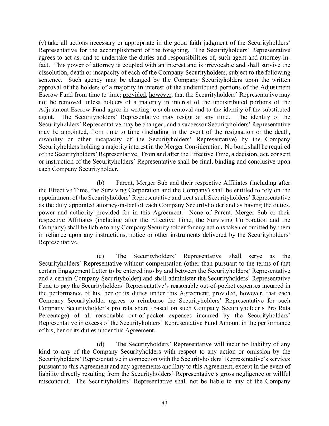 83 (v) take all actions necessary or appropriate in the good faith judgment of the Securityholders’ Representative for the accomplishment of the foregoing. The Securityholders’ Representative agrees to act as, and to undertake the duties and responsibilities of, such agent and attorney-in- fact. This power of attorney is coupled with an interest and is irrevocable and shall survive the dissolution, death or incapacity of each of the Company Securityholders, subject to the following sentence. Such agency may be changed by the Company Securityholders upon the written approval of the holders of a majority in interest of the undistributed portions of the Adjustment Escrow Fund from time to time; provided, however, that the Securityholders’ Representative may not be removed unless holders of a majority in interest of the undistributed portions of the Adjustment Escrow Fund agree in writing to such removal and to the identity of the substituted agent. The Securityholders’ Representative may resign at any time. The identity of the Securityholders’ Representative may be changed, and a successor Securityholders’ Representative may be appointed, from time to time (including in the event of the resignation or the death, disability or other incapacity of the Securityholders’ Representative) by the Company Securityholders holding a majority interest in the Merger Consideration. No bond shall be required of the Securityholders’ Representative. From and after the Effective Time, a decision, act, consent or instruction of the Securityholders’ Representative shall be final, binding and conclusive upon each Company Securityholder. (b) Parent, Merger Sub and their respective Affiliates (including after the Effective Time, the Surviving Corporation and the Company) shall be entitled to rely on the appointment of the Securityholders’ Representative and treat such Securityholders’ Representative as the duly appointed attorney-in-fact of each Company Securityholder and as having the duties, power and authority provided for in this Agreement. None of Parent, Merger Sub or their respective Affiliates (including after the Effective Time, the Surviving Corporation and the Company) shall be liable to any Company Securityholder for any actions taken or omitted by them in reliance upon any instructions, notice or other instruments delivered by the Securityholders’ Representative. (c) The Securityholders’ Representative shall serve as the Securityholders’ Representative without compensation (other than pursuant to the terms of that certain Engagement Letter to be entered into by and between the Securityholders’ Representative and a certain Company Securityholder) and shall administer the Securityholders’ Representative Fund to pay the Securityholders’ Representative’s reasonable out-of-pocket expenses incurred in the performance of his, her or its duties under this Agreement; provided, however, that each Company Securityholder agrees to reimburse the Securityholders’ Representative for such Company Securityholder’s pro rata share (based on such Company Securityholder’s Pro Rata Percentage) of all reasonable out-of-pocket expenses incurred by the Securityholders’ Representative in excess of the Securityholders’ Representative Fund Amount in the performance of his, her or its duties under this Agreement. (d) The Securityholders’ Representative will incur no liability of any kind to any of the Company Securityholders with respect to any action or omission by the Securityholders’ Representative in connection with the Securityholders’ Representative’s services pursuant to this Agreement and any agreements ancillary to this Agreement, except in the event of liability directly resulting from the Securityholders’ Representative’s gross negligence or willful misconduct. The Securityholders’ Representative shall not be liable to any of the Company