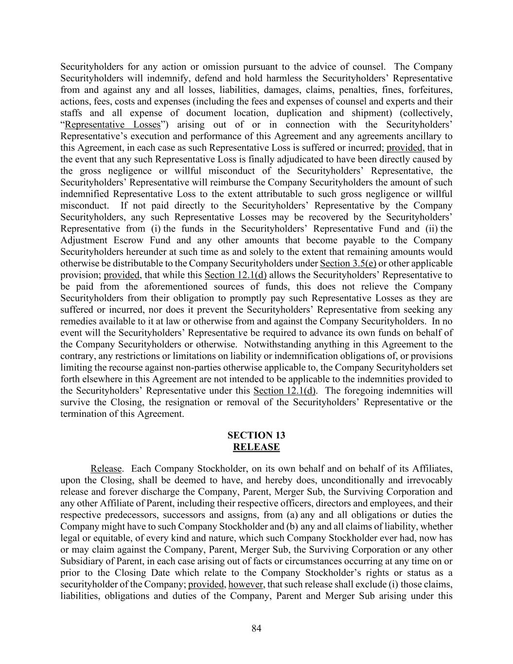 84 Securityholders for any action or omission pursuant to the advice of counsel. The Company Securityholders will indemnify, defend and hold harmless the Securityholders’ Representative from and against any and all losses, liabilities, damages, claims, penalties, fines, forfeitures, actions, fees, costs and expenses (including the fees and expenses of counsel and experts and their staffs and all expense of document location, duplication and shipment) (collectively, “Representative Losses”) arising out of or in connection with the Securityholders’ Representative’s execution and performance of this Agreement and any agreements ancillary to this Agreement, in each case as such Representative Loss is suffered or incurred; provided, that in the event that any such Representative Loss is finally adjudicated to have been directly caused by the gross negligence or willful misconduct of the Securityholders’ Representative, the Securityholders’ Representative will reimburse the Company Securityholders the amount of such indemnified Representative Loss to the extent attributable to such gross negligence or willful misconduct. If not paid directly to the Securityholders’ Representative by the Company Securityholders, any such Representative Losses may be recovered by the Securityholders’ Representative from (i) the funds in the Securityholders’ Representative Fund and (ii) the Adjustment Escrow Fund and any other amounts that become payable to the Company Securityholders hereunder at such time as and solely to the extent that remaining amounts would otherwise be distributable to the Company Securityholders under Section 3.5(e) or other applicable provision; provided, that while this Section 12.1(d) allows the Securityholders’ Representative to be paid from the aforementioned sources of funds, this does not relieve the Company Securityholders from their obligation to promptly pay such Representative Losses as they are suffered or incurred, nor does it prevent the Securityholders’ Representative from seeking any remedies available to it at law or otherwise from and against the Company Securityholders. In no event will the Securityholders’ Representative be required to advance its own funds on behalf of the Company Securityholders or otherwise. Notwithstanding anything in this Agreement to the contrary, any restrictions or limitations on liability or indemnification obligations of, or provisions limiting the recourse against non-parties otherwise applicable to, the Company Securityholders set forth elsewhere in this Agreement are not intended to be applicable to the indemnities provided to the Securityholders’ Representative under this Section 12.1(d). The foregoing indemnities will survive the Closing, the resignation or removal of the Securityholders’ Representative or the termination of this Agreement. SECTION 13 RELEASE Release. Each Company Stockholder, on its own behalf and on behalf of its Affiliates, upon the Closing, shall be deemed to have, and hereby does, unconditionally and irrevocably release and forever discharge the Company, Parent, Merger Sub, the Surviving Corporation and any other Affiliate of Parent, including their respective officers, directors and employees, and their respective predecessors, successors and assigns, from (a) any and all obligations or duties the Company might have to such Company Stockholder and (b) any and all claims of liability, whether legal or equitable, of every kind and nature, which such Company Stockholder ever had, now has or may claim against the Company, Parent, Merger Sub, the Surviving Corporation or any other Subsidiary of Parent, in each case arising out of facts or circumstances occurring at any time on or prior to the Closing Date which relate to the Company Stockholder’s rights or status as a securityholder of the Company; provided, however, that such release shall exclude (i) those claims, liabilities, obligations and duties of the Company, Parent and Merger Sub arising under this