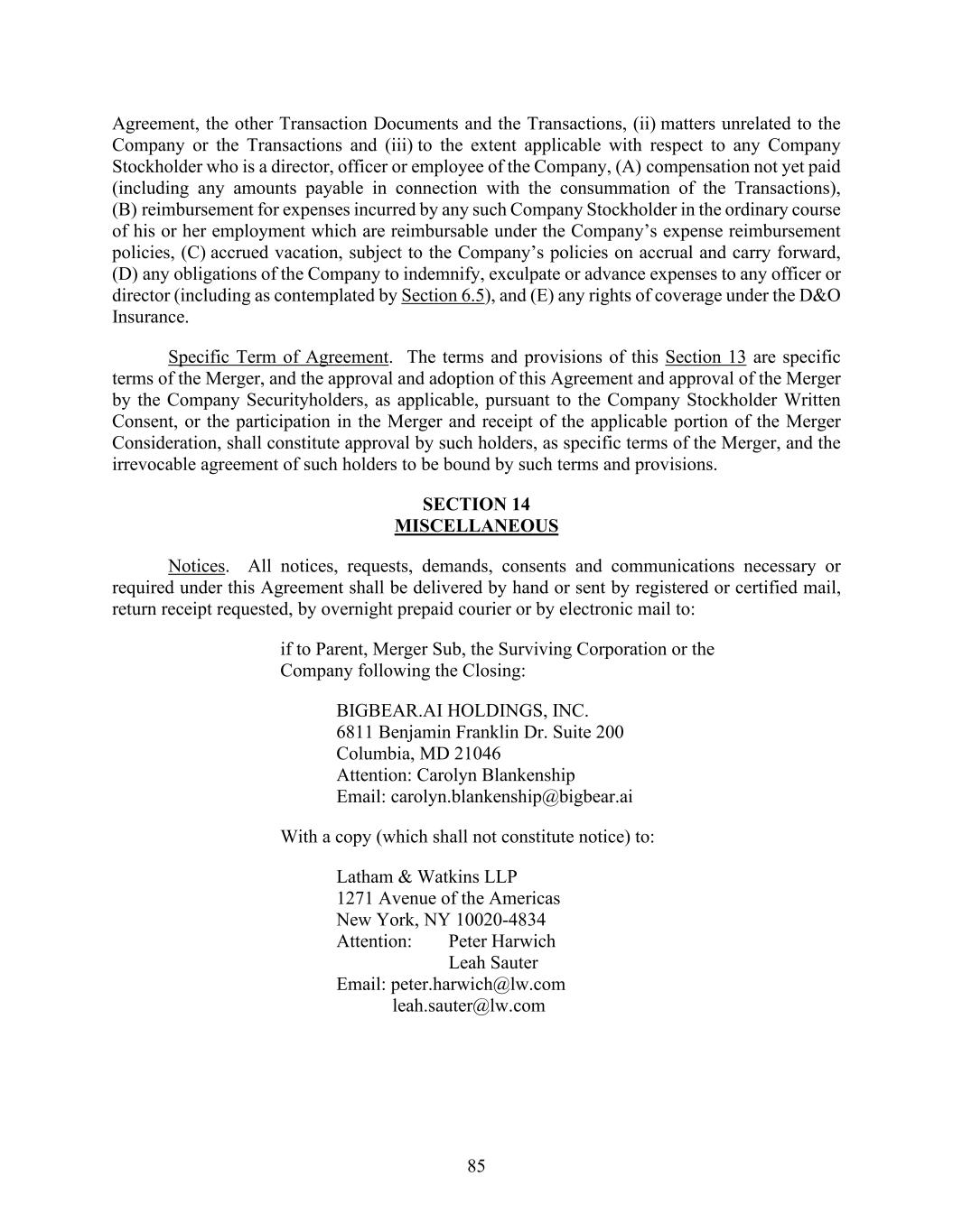 85 Agreement, the other Transaction Documents and the Transactions, (ii) matters unrelated to the Company or the Transactions and (iii) to the extent applicable with respect to any Company Stockholder who is a director, officer or employee of the Company, (A) compensation not yet paid (including any amounts payable in connection with the consummation of the Transactions), (B) reimbursement for expenses incurred by any such Company Stockholder in the ordinary course of his or her employment which are reimbursable under the Company’s expense reimbursement policies, (C) accrued vacation, subject to the Company’s policies on accrual and carry forward, (D) any obligations of the Company to indemnify, exculpate or advance expenses to any officer or director (including as contemplated by Section 6.5), and (E) any rights of coverage under the D&O Insurance. Specific Term of Agreement. The terms and provisions of this Section 13 are specific terms of the Merger, and the approval and adoption of this Agreement and approval of the Merger by the Company Securityholders, as applicable, pursuant to the Company Stockholder Written Consent, or the participation in the Merger and receipt of the applicable portion of the Merger Consideration, shall constitute approval by such holders, as specific terms of the Merger, and the irrevocable agreement of such holders to be bound by such terms and provisions. SECTION 14 MISCELLANEOUS Notices. All notices, requests, demands, consents and communications necessary or required under this Agreement shall be delivered by hand or sent by registered or certified mail, return receipt requested, by overnight prepaid courier or by electronic mail to: if to Parent, Merger Sub, the Surviving Corporation or the Company following the Closing: BIGBEAR.AI HOLDINGS, INC. 6811 Benjamin Franklin Dr. Suite 200 Columbia, MD 21046 Attention: Carolyn Blankenship Email: carolyn.blankenship@bigbear.ai With a copy (which shall not constitute notice) to: Latham & Watkins LLP 1271 Avenue of the Americas New York, NY 10020-4834 Attention: Peter Harwich Leah Sauter Email: peter.harwich@lw.com leah.sauter@lw.com
