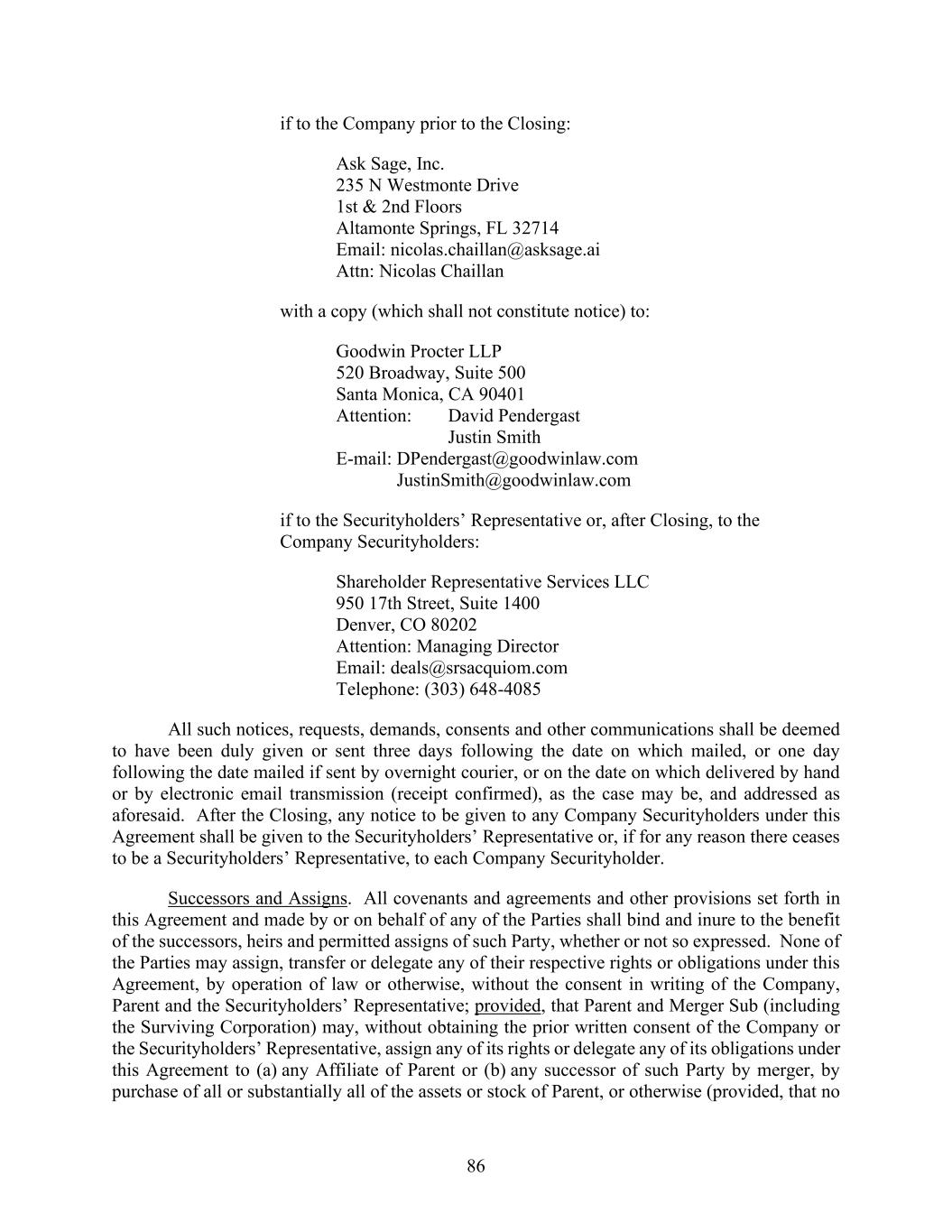 86 if to the Company prior to the Closing: Ask Sage, Inc. 235 N Westmonte Drive 1st & 2nd Floors Altamonte Springs, FL 32714 Email: nicolas.chaillan@asksage.ai Attn: Nicolas Chaillan with a copy (which shall not constitute notice) to: Goodwin Procter LLP 520 Broadway, Suite 500 Santa Monica, CA 90401 Attention: David Pendergast Justin Smith E-mail: DPendergast@goodwinlaw.com JustinSmith@goodwinlaw.com if to the Securityholders’ Representative or, after Closing, to the Company Securityholders: Shareholder Representative Services LLC 950 17th Street, Suite 1400 Denver, CO 80202 Attention: Managing Director Email: deals@srsacquiom.com Telephone: (303) 648-4085 All such notices, requests, demands, consents and other communications shall be deemed to have been duly given or sent three days following the date on which mailed, or one day following the date mailed if sent by overnight courier, or on the date on which delivered by hand or by electronic email transmission (receipt confirmed), as the case may be, and addressed as aforesaid. After the Closing, any notice to be given to any Company Securityholders under this Agreement shall be given to the Securityholders’ Representative or, if for any reason there ceases to be a Securityholders’ Representative, to each Company Securityholder. Successors and Assigns. All covenants and agreements and other provisions set forth in this Agreement and made by or on behalf of any of the Parties shall bind and inure to the benefit of the successors, heirs and permitted assigns of such Party, whether or not so expressed. None of the Parties may assign, transfer or delegate any of their respective rights or obligations under this Agreement, by operation of law or otherwise, without the consent in writing of the Company, Parent and the Securityholders’ Representative; provided, that Parent and Merger Sub (including the Surviving Corporation) may, without obtaining the prior written consent of the Company or the Securityholders’ Representative, assign any of its rights or delegate any of its obligations under this Agreement to (a) any Affiliate of Parent or (b) any successor of such Party by merger, by purchase of all or substantially all of the assets or stock of Parent, or otherwise (provided, that no