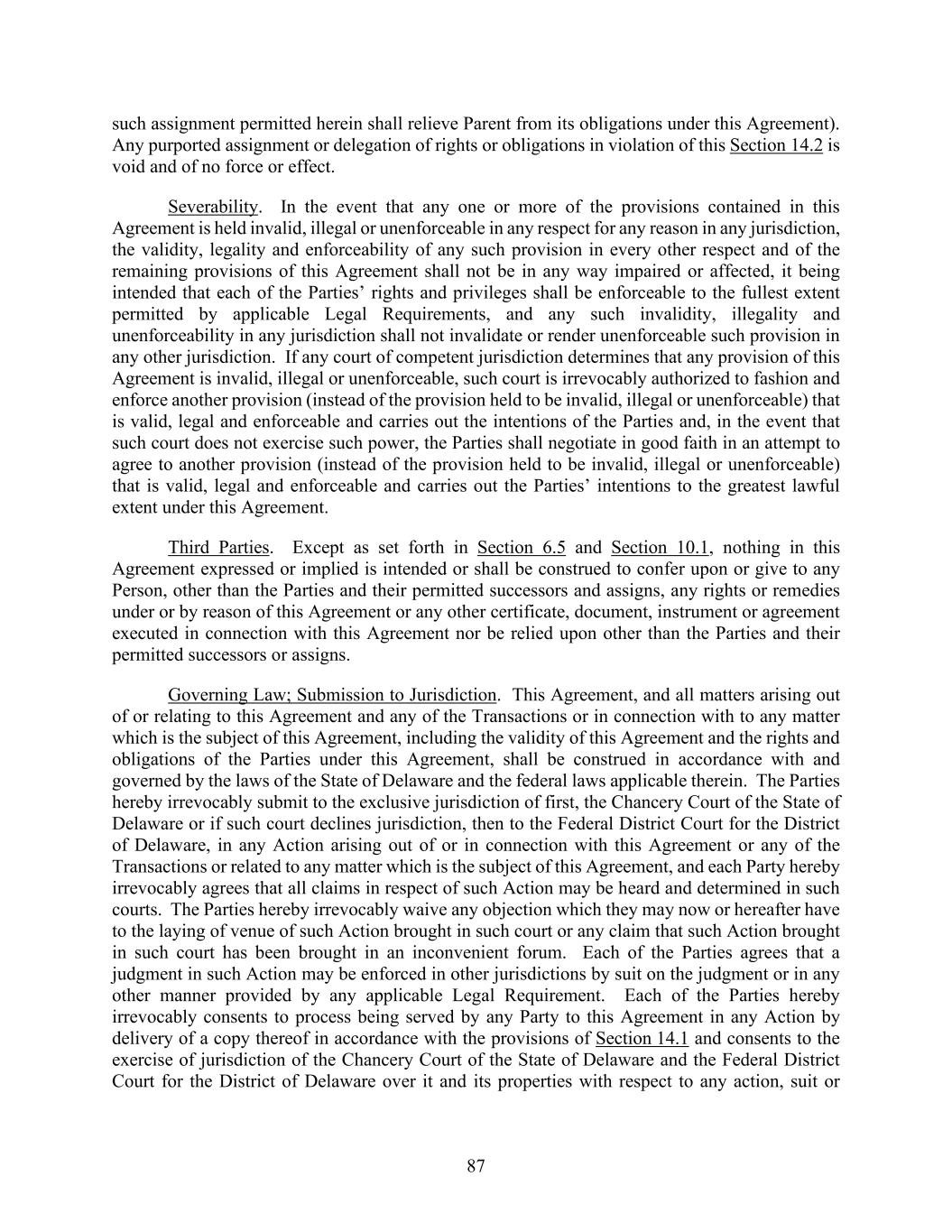 87 such assignment permitted herein shall relieve Parent from its obligations under this Agreement). Any purported assignment or delegation of rights or obligations in violation of this Section 14.2 is void and of no force or effect. Severability. In the event that any one or more of the provisions contained in this Agreement is held invalid, illegal or unenforceable in any respect for any reason in any jurisdiction, the validity, legality and enforceability of any such provision in every other respect and of the remaining provisions of this Agreement shall not be in any way impaired or affected, it being intended that each of the Parties’ rights and privileges shall be enforceable to the fullest extent permitted by applicable Legal Requirements, and any such invalidity, illegality and unenforceability in any jurisdiction shall not invalidate or render unenforceable such provision in any other jurisdiction. If any court of competent jurisdiction determines that any provision of this Agreement is invalid, illegal or unenforceable, such court is irrevocably authorized to fashion and enforce another provision (instead of the provision held to be invalid, illegal or unenforceable) that is valid, legal and enforceable and carries out the intentions of the Parties and, in the event that such court does not exercise such power, the Parties shall negotiate in good faith in an attempt to agree to another provision (instead of the provision held to be invalid, illegal or unenforceable) that is valid, legal and enforceable and carries out the Parties’ intentions to the greatest lawful extent under this Agreement. Third Parties. Except as set forth in Section 6.5 and Section 10.1, nothing in this Agreement expressed or implied is intended or shall be construed to confer upon or give to any Person, other than the Parties and their permitted successors and assigns, any rights or remedies under or by reason of this Agreement or any other certificate, document, instrument or agreement executed in connection with this Agreement nor be relied upon other than the Parties and their permitted successors or assigns. Governing Law; Submission to Jurisdiction. This Agreement, and all matters arising out of or relating to this Agreement and any of the Transactions or in connection with to any matter which is the subject of this Agreement, including the validity of this Agreement and the rights and obligations of the Parties under this Agreement, shall be construed in accordance with and governed by the laws of the State of Delaware and the federal laws applicable therein. The Parties hereby irrevocably submit to the exclusive jurisdiction of first, the Chancery Court of the State of Delaware or if such court declines jurisdiction, then to the Federal District Court for the District of Delaware, in any Action arising out of or in connection with this Agreement or any of the Transactions or related to any matter which is the subject of this Agreement, and each Party hereby irrevocably agrees that all claims in respect of such Action may be heard and determined in such courts. The Parties hereby irrevocably waive any objection which they may now or hereafter have to the laying of venue of such Action brought in such court or any claim that such Action brought in such court has been brought in an inconvenient forum. Each of the Parties agrees that a judgment in such Action may be enforced in other jurisdictions by suit on the judgment or in any other manner provided by any applicable Legal Requirement. Each of the Parties hereby irrevocably consents to process being served by any Party to this Agreement in any Action by delivery of a copy thereof in accordance with the provisions of Section 14.1 and consents to the exercise of jurisdiction of the Chancery Court of the State of Delaware and the Federal District Court for the District of Delaware over it and its properties with respect to any action, suit or