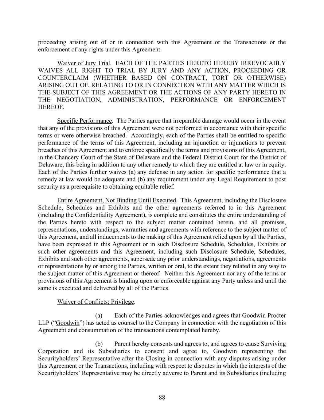 88 proceeding arising out of or in connection with this Agreement or the Transactions or the enforcement of any rights under this Agreement. Waiver of Jury Trial. EACH OF THE PARTIES HERETO HEREBY IRREVOCABLY WAIVES ALL RIGHT TO TRIAL BY JURY AND ANY ACTION, PROCEEDING OR COUNTERCLAIM (WHETHER BASED ON CONTRACT, TORT OR OTHERWISE) ARISING OUT OF, RELATING TO OR IN CONNECTION WITH ANY MATTER WHICH IS THE SUBJECT OF THIS AGREEMENT OR THE ACTIONS OF ANY PARTY HERETO IN THE NEGOTIATION, ADMINISTRATION, PERFORMANCE OR ENFORCEMENT HEREOF. Specific Performance. The Parties agree that irreparable damage would occur in the event that any of the provisions of this Agreement were not performed in accordance with their specific terms or were otherwise breached. Accordingly, each of the Parties shall be entitled to specific performance of the terms of this Agreement, including an injunction or injunctions to prevent breaches of this Agreement and to enforce specifically the terms and provisions of this Agreement, in the Chancery Court of the State of Delaware and the Federal District Court for the District of Delaware, this being in addition to any other remedy to which they are entitled at law or in equity. Each of the Parties further waives (a) any defense in any action for specific performance that a remedy at law would be adequate and (b) any requirement under any Legal Requirement to post security as a prerequisite to obtaining equitable relief. Entire Agreement, Not Binding Until Executed. This Agreement, including the Disclosure Schedule, Schedules and Exhibits and the other agreements referred to in this Agreement (including the Confidentiality Agreement), is complete and constitutes the entire understanding of the Parties hereto with respect to the subject matter contained herein, and all promises, representations, understandings, warranties and agreements with reference to the subject matter of this Agreement, and all inducements to the making of this Agreement relied upon by all the Parties, have been expressed in this Agreement or in such Disclosure Schedule, Schedules, Exhibits or such other agreements and this Agreement, including such Disclosure Schedule, Schedules, Exhibits and such other agreements, supersede any prior understandings, negotiations, agreements or representations by or among the Parties, written or oral, to the extent they related in any way to the subject matter of this Agreement or thereof. Neither this Agreement nor any of the terms or provisions of this Agreement is binding upon or enforceable against any Party unless and until the same is executed and delivered by all of the Parties. Waiver of Conflicts; Privilege. (a) Each of the Parties acknowledges and agrees that Goodwin Procter LLP (“Goodwin”) has acted as counsel to the Company in connection with the negotiation of this Agreement and consummation of the transactions contemplated hereby. (b) Parent hereby consents and agrees to, and agrees to cause Surviving Corporation and its Subsidiaries to consent and agree to, Goodwin representing the Securityholders’ Representative after the Closing in connection with any disputes arising under this Agreement or the Transactions, including with respect to disputes in which the interests of the Securityholders’ Representative may be directly adverse to Parent and its Subsidiaries (including