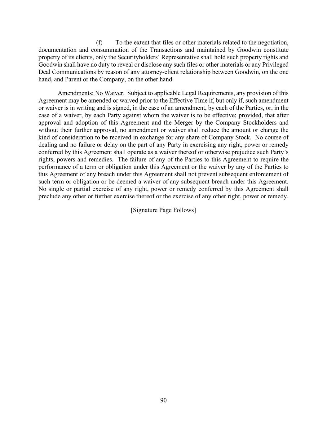 90 (f) To the extent that files or other materials related to the negotiation, documentation and consummation of the Transactions and maintained by Goodwin constitute property of its clients, only the Securityholders’ Representative shall hold such property rights and Goodwin shall have no duty to reveal or disclose any such files or other materials or any Privileged Deal Communications by reason of any attorney-client relationship between Goodwin, on the one hand, and Parent or the Company, on the other hand. Amendments; No Waiver. Subject to applicable Legal Requirements, any provision of this Agreement may be amended or waived prior to the Effective Time if, but only if, such amendment or waiver is in writing and is signed, in the case of an amendment, by each of the Parties, or, in the case of a waiver, by each Party against whom the waiver is to be effective; provided, that after approval and adoption of this Agreement and the Merger by the Company Stockholders and without their further approval, no amendment or waiver shall reduce the amount or change the kind of consideration to be received in exchange for any share of Company Stock. No course of dealing and no failure or delay on the part of any Party in exercising any right, power or remedy conferred by this Agreement shall operate as a waiver thereof or otherwise prejudice such Party’s rights, powers and remedies. The failure of any of the Parties to this Agreement to require the performance of a term or obligation under this Agreement or the waiver by any of the Parties to this Agreement of any breach under this Agreement shall not prevent subsequent enforcement of such term or obligation or be deemed a waiver of any subsequent breach under this Agreement. No single or partial exercise of any right, power or remedy conferred by this Agreement shall preclude any other or further exercise thereof or the exercise of any other right, power or remedy. [Signature Page Follows]
