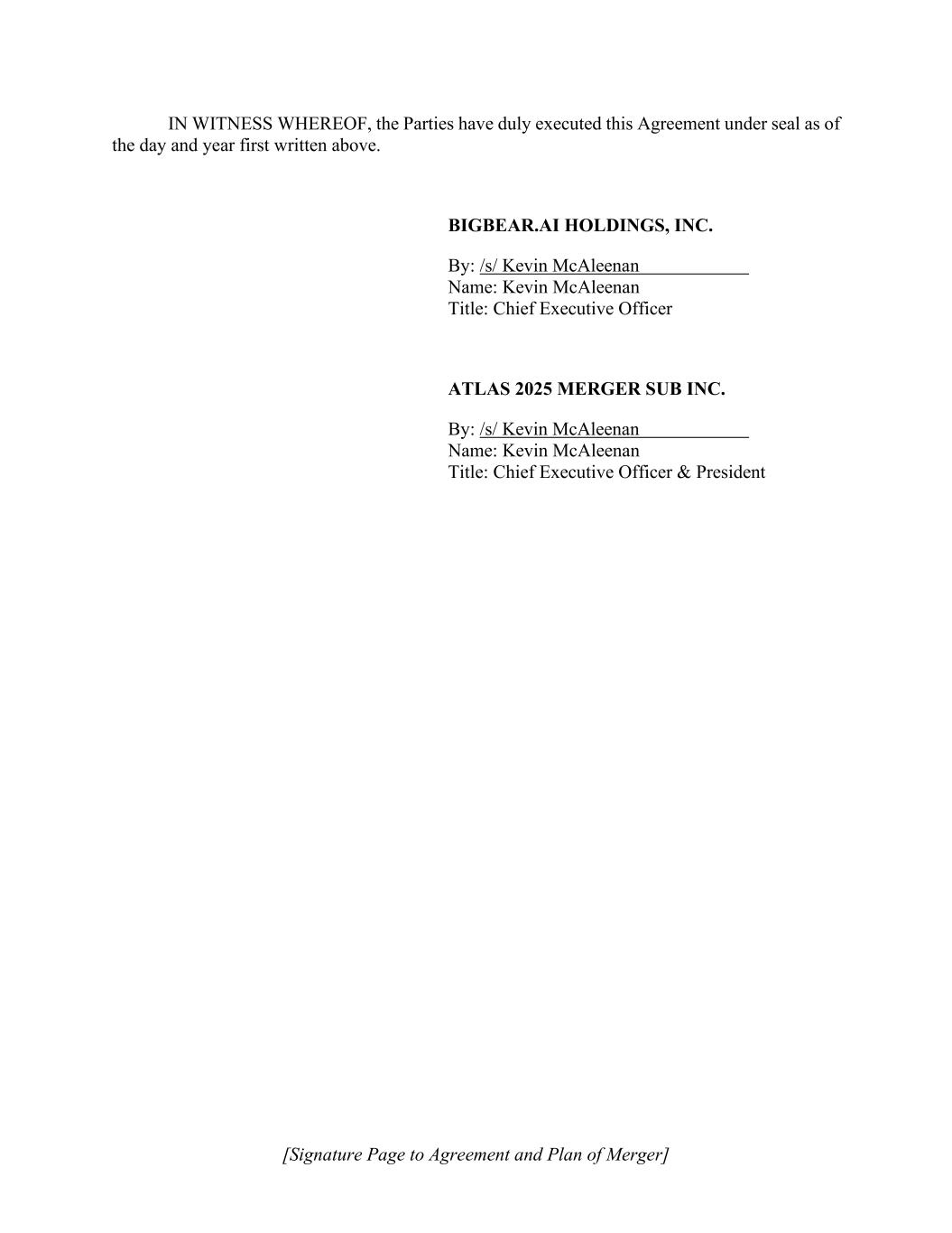 [Signature Page to Agreement and Plan of Merger] IN WITNESS WHEREOF, the Parties have duly executed this Agreement under seal as of the day and year first written above. BIGBEAR.AI HOLDINGS, INC. By: /s/ Kevin McAleenan Name: Kevin McAleenan Title: Chief Executive Officer ATLAS 2025 MERGER SUB INC. By: /s/ Kevin McAleenan Name: Kevin McAleenan Title: Chief Executive Officer & President