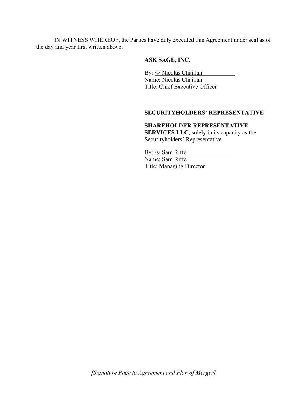 [Signature Page to Agreement and Plan of Merger] IN WITNESS WHEREOF, the Parties have duly executed this Agreement under seal as of the day and year first written above. ASK SAGE, INC. By: /s/ Nicolas Chaillan Name: Nicolas Chaillan Title: Chief Executive Officer SECURITYHOLDERS’ REPRESENTATIVE SHAREHOLDER REPRESENTATIVE SERVICES LLC, solely in its capacity as the Securityholders’ Representative By: /s/ Sam Riffe Name: Sam Riffe Title: Managing Director