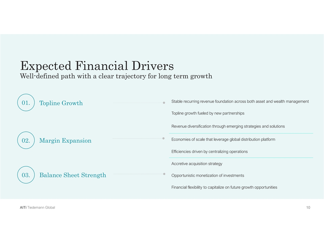 Expected Financial Drivers Well-defined path with a clear trajectory for long term growth Stable recurring revenue foundation across both asset and wealth management 01. Topline Growth Topline growth fueled by new partnerships Revenue diversification through emerging strategies and solutions Economies of scale that leverage global distribution platform 02. Margin Expansion Efficiencies driven by centralizing operations Accretive acquisition strategy Opportunistic monetization of investments 03. Balance Sheet Strength Financial flexibility to capitalize on future growth opportunities A Al lT Ti i T Tiie ed de em ma an nn n G Gllo ob ba all 1 10 0