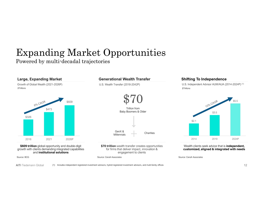 Expanding Market Opportunities Powered by multi-decadal trajectories Large, Expanding Market Generational Wealth Transfer Shifting To Independence (1) U.S. Independent Advisor AUM/AUA (2014-2024P) Growth of Global Wealth (2021-2026P) U.S. Wealth Transfer (2018-2042P) $Trillions $Trillions $5.5 $609 $70 Trillion from $473 Baby Boomers & Older $3.5 $326 $2.1 GenX & Charities Millennials + 2014 2019 2024P 2016 2021 2026P $609 trillion global opportunity and double-digit $70 trillion wealth transfer creates opportunities Wealth clients seek advice that is independent, growth with clients demanding integrated capabilities for firms that deliver impact, innovation & customized, aligned & integrated with needs and institutional solutions engagement to clients Source: BCG Source: Cerulli Associates Source: Cerulli Associates (1) Includes independent registered investment advisors, hybrid registered investment advisors, and multi-family offices A Al lT Ti i T Tiie ed de em ma an nn n G Gllo ob ba all 1 1 12 2 2