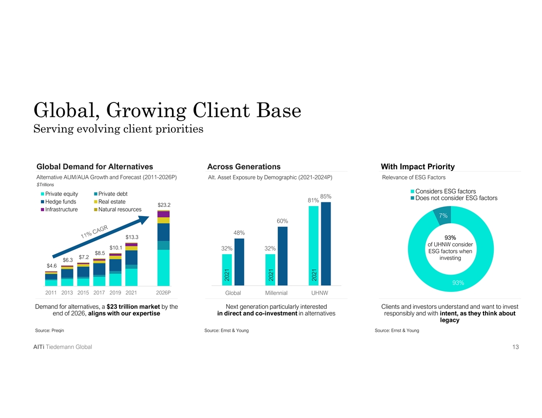 Global, Growing Client Base Serving evolving client priorities Global Demand for Alternatives Across Generations With Impact Priority Alternative AUM/AUA Growth and Forecast (2011-2026P) Alt. Asset Exposure by Demographic (2021-2024P) Relevance of ESG Factors $Trillions Considers ESG factors Private equity Private debt 85% Does not consider ESG factors 81% Hedge funds Real estate $23.2 Infrastructure Natural resources 7% 60% 48% $13.3 93% of UHNW consider $10.1 32% 32% ESG factors when $8.5 $7.2 investing $6.3 $4.6 93% 2011 2013 2015 2017 2019 2021 2026P Global Millennial UHNW Demand for alternatives, a $23 trillion market by the Next generation particularly interested Clients and investors understand and want to invest end of 2026, aligns with our expertise in direct and co-investment in alternatives responsibly and with intent, as they think about legacy Source: Preqin Source: Ernst & Young Source: Ernst & Young A Al lT Ti i T Tiie ed de em ma an nn n G Gllo ob ba all 1 1 13 3 3 2021 2021 2021