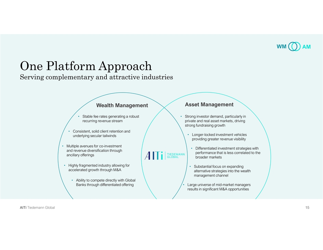WM AM One Platform Approach Serving complementary and attractive industries Asset Management Wealth Management • Stable fee rates generating a robust • Strong investor demand, particularly in recurring revenue stream private and real asset markets, driving strong fundraising growth • Consistent, solid client retention and • Longer-locked investment vehicles underlying secular tailwinds providing greater revenue visibility • Multiple avenues for co-investment • Differentiated investment strategies with and revenue diversification through performance that is less correlated to the ancillary offerings broader markets • Highly fragmented industry allowing for • Substantial focus on expanding accelerated growth through M&A alternative strategies into the wealth management channel • Ability to compete directly with Global Banks through differentiated offering• Large universe of mid-market managers results in significant M&A opportunities A Al lT Ti i T Tiie ed de em ma an nn n G Gllo ob ba all 1 1 15 5 5