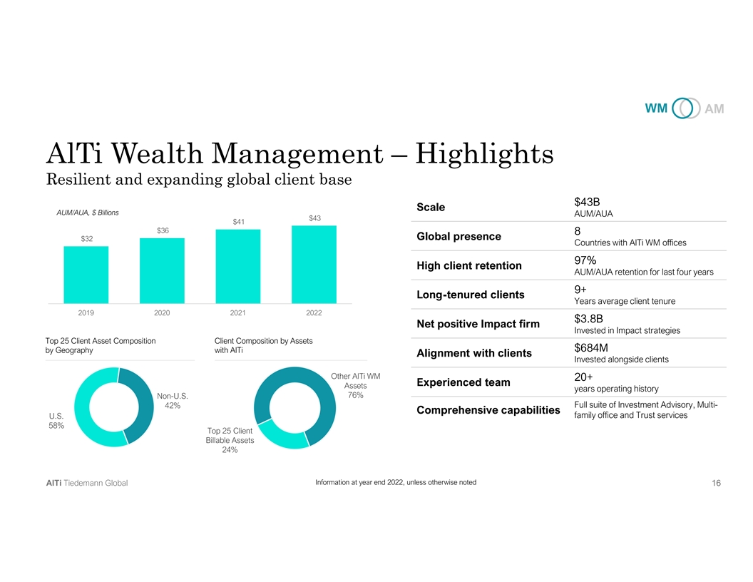 WM AM AlTi Wealth Management – Highlights Resilient and expanding global client base $43B Scale AUM/AUA, $ Billions AUM/AUA $43 $41 $36 8 Global presence $32 Countries with AlTi WM offices 97% High client retention AUM/AUA retention for last four years 9+ Long-tenured clients Years average client tenure 2019 2020 2021 2022 $3.8B Net positive Impact firm Invested in Impact strategies Top 25 Client Asset Composition Client Composition by Assets $684M by Geography with AlTi Alignment with clients Invested alongside clients Other AlTi WM 20+ Experienced team Assets years operating history Non-U.S. 76% 42% Full suite of Investment Advisory, Multi- Comprehensive capabilities family office and Trust services U.S. 58% Top 25 Client Billable Assets 24% Information at year end 2022, unless otherwise noted AlTi Tiedemann Global 1 16 6