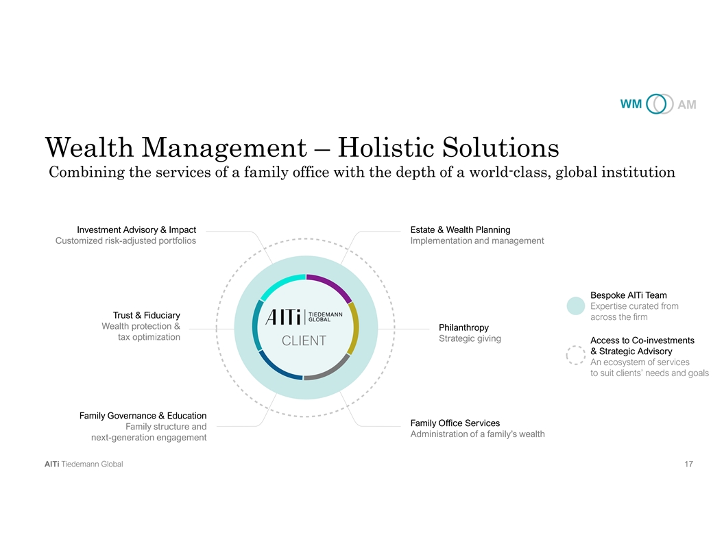 WM AM Wealth Management – Holistic Solutions Combining the services of a family office with the depth of a world-class, global institution Investment Advisory & Impact Estate & Wealth Planning Customized risk-adjusted portfolios Implementation and management Bespoke AlTi Team Expertise curated from Trust & Fiduciary across the firm Wealth protection & Philanthropy tax optimization Strategic giving Access to Co-investments CLIENT & Strategic Advisory An ecosystem of services to suit clients’ needs and goals Family Governance & Education Family Office Services Family structure and Administration of a family’s wealth next-generation engagement AlTi Tiedemann Global 17