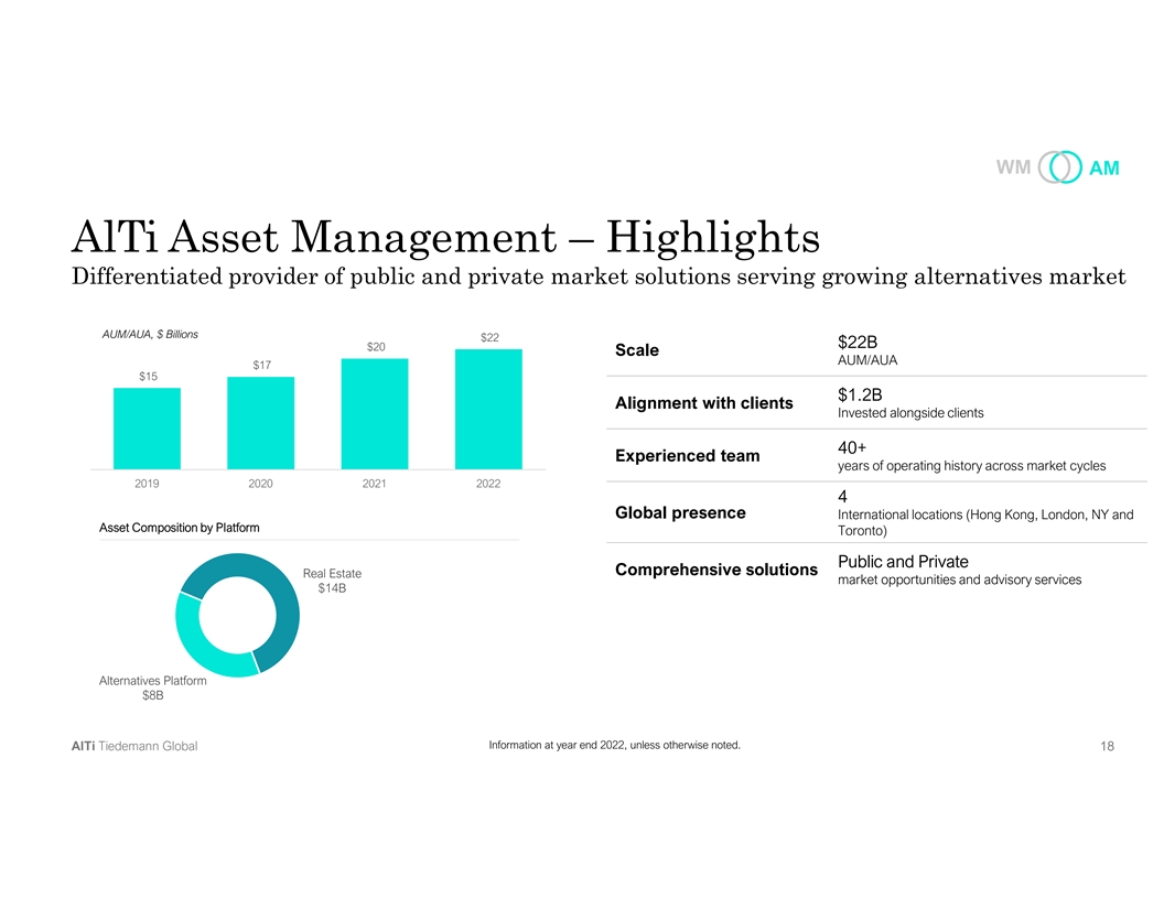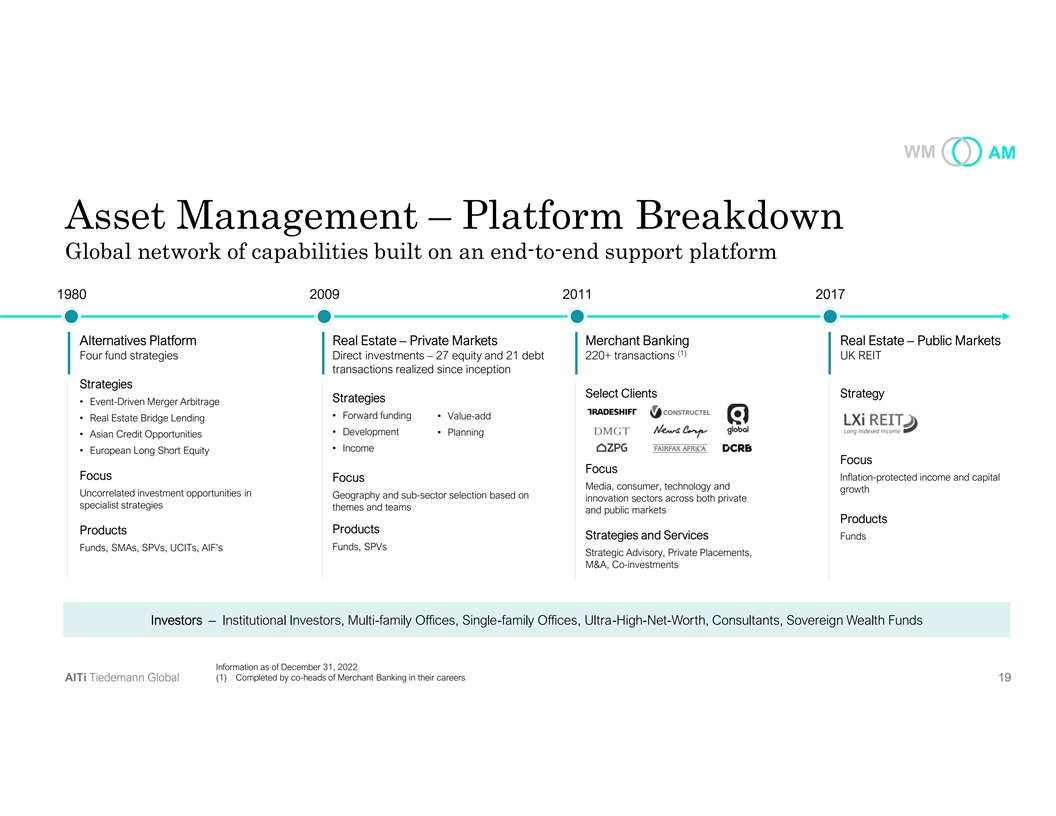 WM AM Asset Management – Platform Breakdown Global network of capabilities built on an end-to-end support platform 1980 2009 2011 2017 Alternatives Platform Real Estate – Private Markets Merchant Banking Real Estate – Public Markets (1) Four fund strategies Direct investments – 27 equity and 21 debt 220+ transactions UK REIT transactions realized since inception Strategies Select Clients Strategy Strategies • Event-Driven Merger Arbitrage • Forward funding • Value-add • Real Estate Bridge Lending • Development• Planning • Asian Credit Opportunities • Income • European Long Short Equity Focus Focus Focus Focus Inflation-protected income and capital Media, consumer, technology and growth Uncorrelated investment opportunities in Geography and sub-sector selection based on innovation sectors across both private specialist strategies themes and teams and public markets Products Products Products Strategies and Services Funds Funds, SPVs Funds, SMAs, SPVs, UCITs, AIF’s Strategic Advisory, Private Placements, M&A, Co-investments Investors – Institutional Investors, Multi-family Offices, Single-family Offices, Ultra-High-Net-Worth, Consultants, Sovereign Wealth Funds Information as of December 31, 2022 AlTi Tiedemann Global (1) Completed by co-heads of Merchant Banking in their careers 1 19 9
