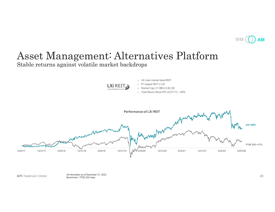 WM AM Asset Management: Alternatives Platform Stable returns against volatile market backdrops o UK main market listed REIT th o 6 largest REIT in UK o Market Cap: £1.9B/U.S.$2.3B o Total Return Since IPO (2/27/17): +48% Performance of LXi REIT LXI +48% FTSE 250 +17% 6/30/17 12/31/17 6/30/18 12/31/18 6/30/19 12/31/19 6/30/20 12/31/20 6/30/21 12/31/21 6/30/22 12/31/22 All information as of December 31, 2022 AlTi Tiedemann Global 20 Benchmark : FTSE 250 Index