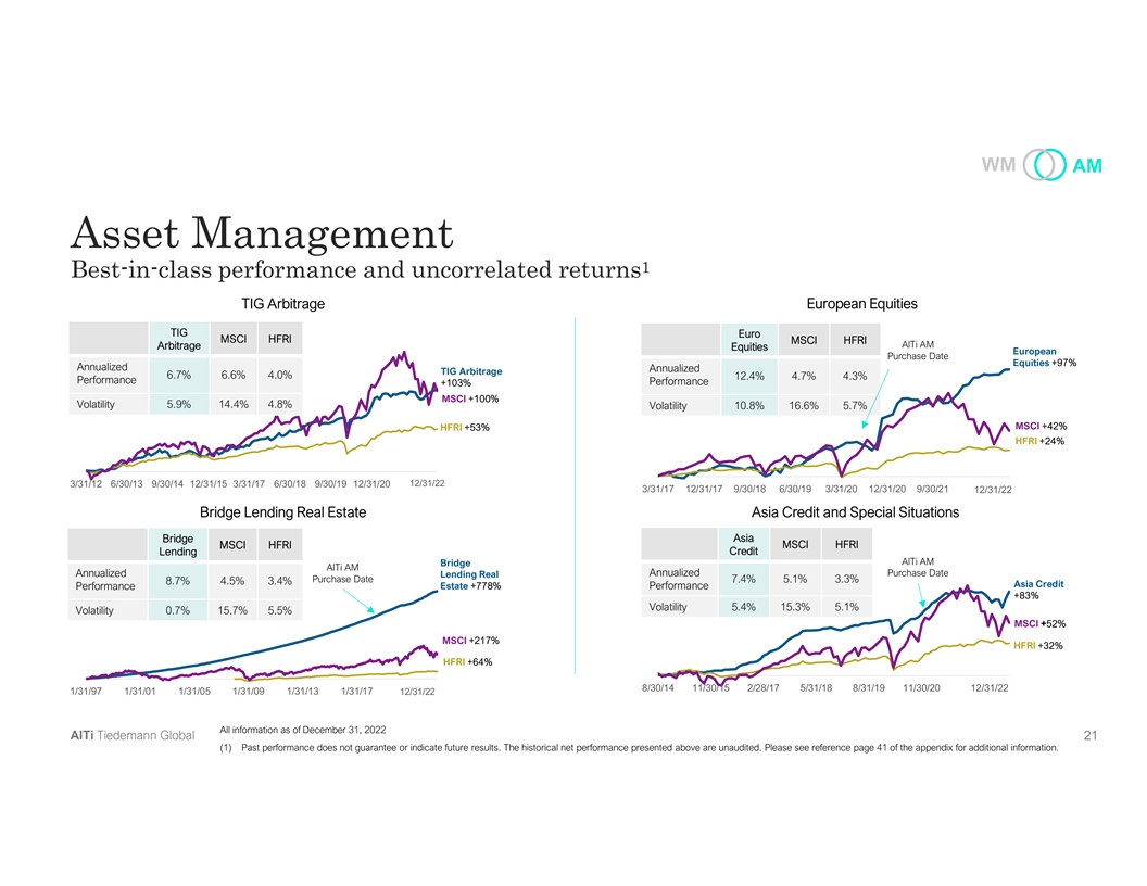 WM AM Asset Management 1 Best-in-class performance and uncorrelated returns TIG Arbitrage European Equities TIG Euro MSCI HFRI MSCI HFRI Arbitrage AlTi AM Equities European Purchase Date Equities +97% Annualized Annualized TIG Arbitrage 6.7% 6.6% 4.0% 12.4% 4.7% 4.3% Performance Performance +103% MSCI +100% Volatility 5.9% 14.4% 4.8% Volatility 10.8% 16.6% 5.7% MSCI +42% HFRI +53% HFRI +24% 12/31/22 3/31/12 6/30/13 9/30/14 12/31/15 3/31/17 6/30/18 9/30/19 12/31/20 3/31/22 3/31/17 12/31/17 9/30/18 6/30/19 3/31/20 12/31/20 9/30/21 6/30/22 12/31/22 Bridge Lending Real Estate Asia Credit and Special Situations Asia Bridge MSCI HFRI MSCI HFRI Credit Lending AlTi AM Bridge AlTi AM Annualized Purchase Date Annualized Lending Real Purchase Date 7.4% 5.1% 3.3% 8.7% 4.5% 3.4% Asia Credit Estate +778% Performance Performance +83% Volatility 5.4% 15.3% 5.1% Volatility 0.7% 15.7% 5.5% MSCI +52% MSCI +217% HFRI +32% HFRI +64% 12/31/22 8/30/14 11/30/15 2/28/17 5/31/18 8/31/19 11/30/20 2/21 82 /2 /3 21/22 1/31/97 1/31/01 1/31/05 1/31/09 1/31/13 1/31/17 11 /3 21 /3 /2 11 /22 All information as of December 31, 2022 AlTi Tiedemann Global 21 (1) Past performance does not guarantee or indicate future results. The historical net performance presented above are unaudited. Please see reference page 41 of the appendix for additional information.