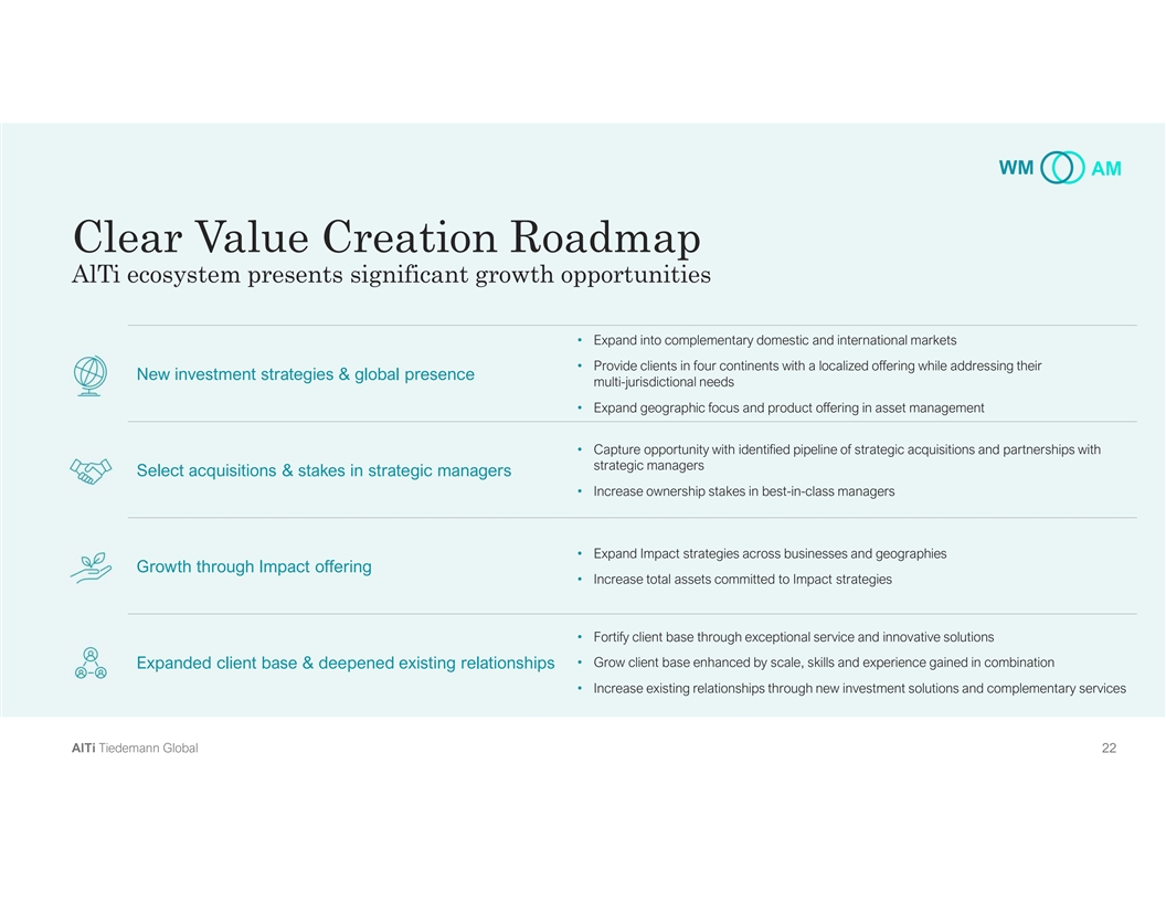 WM AM Clear Value Creation Roadmap AlTi ecosystem presents significant growth opportunities • Expand into complementary domestic and international markets • Provide clients in four continents with a localized offering while addressing their New investment strategies & global presence multi-jurisdictional needs • Expand geographic focus and product offering in asset management • Capture opportunity with identified pipeline of strategic acquisitions and partnerships with strategic managers Select acquisitions & stakes in strategic managers • Increase ownership stakes in best-in-class managers • Expand Impact strategies across businesses and geographies Growth through Impact offering • Increase total assets committed to Impact strategies • Fortify client base through exceptional service and innovative solutions • Grow client base enhanced by scale, skills and experience gained in combination Expanded client base & deepened existing relationships • Increase existing relationships through new investment solutions and complementary services A Al lT Ti i T Tiie ed de em ma an nn n G Gllo ob ba all 2 22 2