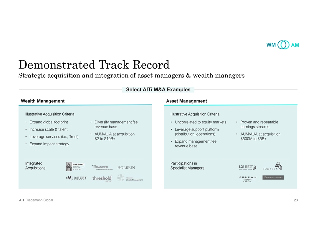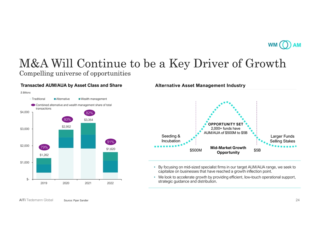 WM AM Demonstrated Track Record Strategic acquisition and integration of asset managers & wealth managers Select AlTi M&A Examples Wealth Management Asset Management Illustrative Acquisition Criteria Illustrative Acquisition Criteria • Expand global footprint• Diversify management fee • Uncorrelated to equity markets • Proven and repeatable revenue base earnings streams • Increase scale & talent• Leverage support platform • AUM/AUA at acquisition (distribution, operations)• AUM/AUA at acquisition • Leverage services (i.e., Trust) $2 to $10B+ $500M to $5B+ • Expand management fee • Expand Impact strategy revenue base Integrated Participations in Acquisitions Specialist Managers AlTi Tiedemann Global 23
