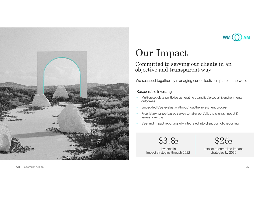 WM AM Our Impact Committed to serving our clients in an objective and transparent way We succeed together by managing our collective impact on the world. Responsible Investing • Multi-asset class portfolios generating quantifiable social & environmental outcomes • Embedded ESG evaluation throughout the investment process • Proprietary values-based survey to tailor portfolios to client’s Impact & values objective • ESG and Impact reporting fully integrated into client portfolio reporting $3.8B $25B Invested in expect to commit to Impact Impact strategies through 2022 strategies by 2030 AlTi Tiedemann Global 25