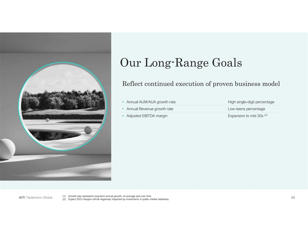 Our Long-Range Goals Reflect continued execution of proven business model • Annual AUM/AUA growth rate High single-digit percentage • Annual Revenue growth rate Low-teens percentage (2) • Adjusted EBITDA margin Expansion to mid 30s (1) Growth rate represents long-term annual growth, on average and over time. A Al lT Ti i T Tiie ed de em ma an nn n G Gllo ob ba all 2 28 8 (2) Expect 2023 margins will be negatively impacted by investments in public market readiness.
