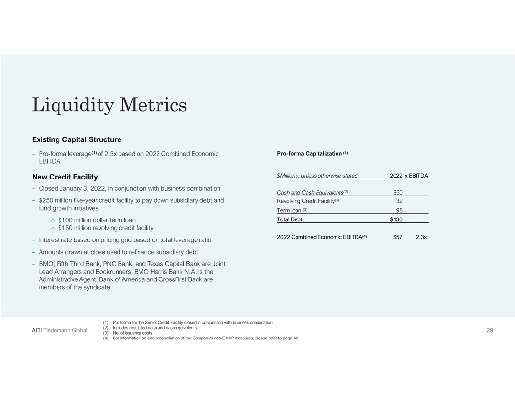 Liquidity Metrics Existing Capital Structure (1) (1) Pro-forma Capitalization – Pro-forma leverage of 2.3x based on 2022 Combined Economic EBITDA $Millions, unless otherwise stated 2022 x EBITDA New Credit Facility – Closed January 3, 2022, in conjunction with business combination (2) Cash and Cash Equivalents $50 (3) – $250 million five-year credit facility to pay down subsidiary debt and Revolving Credit Facility 32 fund growth initiatives (3) Term loan 98 Total Debt $130 o $100 million dollar term loan o $150 million revolving credit facility (4) 2022 Combined Economic EBITDA $57 2.3x – Interest rate based on pricing grid based on total leverage ratio – Amounts drawn at close used to refinance subsidiary debt – BMO, Fifth Third Bank, PNC Bank, and Texas Capital Bank are Joint Lead Arrangers and Bookrunners. BMO Harris Bank N.A. is the Administrative Agent. Bank of America and CrossFirst Bank are members of the syndicate. (1) Pro forma for the Senior Credit Facility closed in conjunction with business combination (2) Includes restricted cash and cash equivalents A Al lT Ti i T Tiie ed de em ma an nn n G Gllo ob ba all 2 29 9 (3) Net of issuance costs (4) For information on and reconciliation of the Company's non-GAAP measures, please refer to page 42