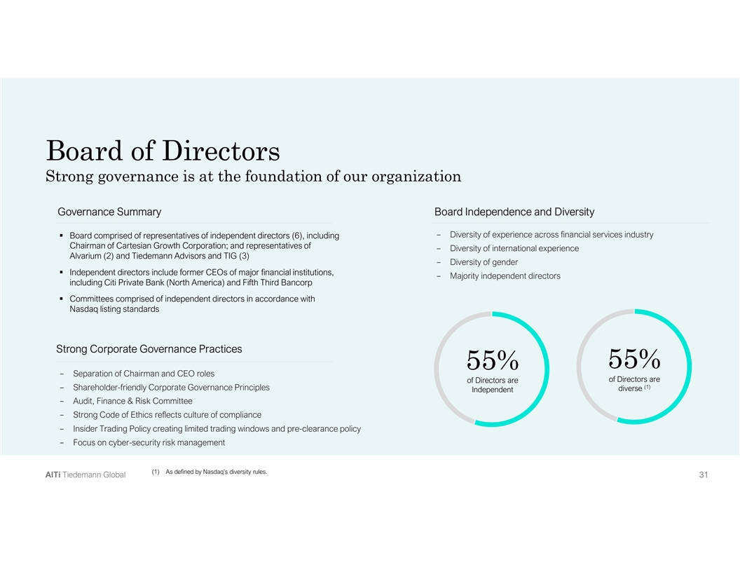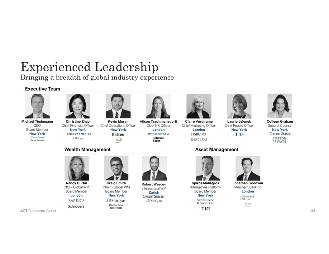 Board of Directors Strong governance is at the foundation of our organization Governance Summary Board Independence and Diversity - Diversity of experience across financial services industry § Board comprised of representatives of independent directors (6), including Chairman of Cartesian Growth Corporation; and representatives of - Diversity of international experience Alvarium (2) and Tiedemann Advisors and TIG (3) - Diversity of gender § Independent directors include former CEOs of major financial institutions, - Majority independent directors including Citi Private Bank (North America) and Fifth Third Bancorp § Committees comprised of independent directors in accordance with Nasdaq listing standards Strong Corporate Governance Practices 55% 55% - Separation of Chairman and CEO roles of Directors are of Directors are (1) - Shareholder-friendly Corporate Governance Principles diverse Independent - Audit, Finance & Risk Committee - Strong Code of Ethics reflects culture of compliance - Insider Trading Policy creating limited trading windows and pre-clearance policy - Focus on cyber-security risk management (1) As defined by Nasdaq’s diversity rules. A Al lT Ti i T Tiie ed de em ma an nn n G Gllo ob ba all 3 31 1