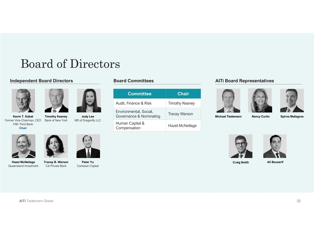 Board of Directors Independent Board Directors Board Committees AlTi Board Representatives Committee Chair Audit, Finance & Risk Timothy Keaney Environmental, Social, Tracey Warson Kevin T. Kabat Timothy Keaney Judy Lee Governance & Nominating Michael Tiedemann Nancy Curtin Spiros Maliagros Former Vice-Chairman, CEO Bank of New York MD of Dragonfly LLC Human Capital & Fifth Third Bank Hazel McNeilage Chair Compensation Hazel McNeilage Tracey B. Warson Peter Yu Craig Smith Ali Bouzarif Queensland Investment Citi Private Bank Cartesian Capital A Al lT Ti i T Tiie ed de em ma an nn n G Gllo ob ba all 3 32 2