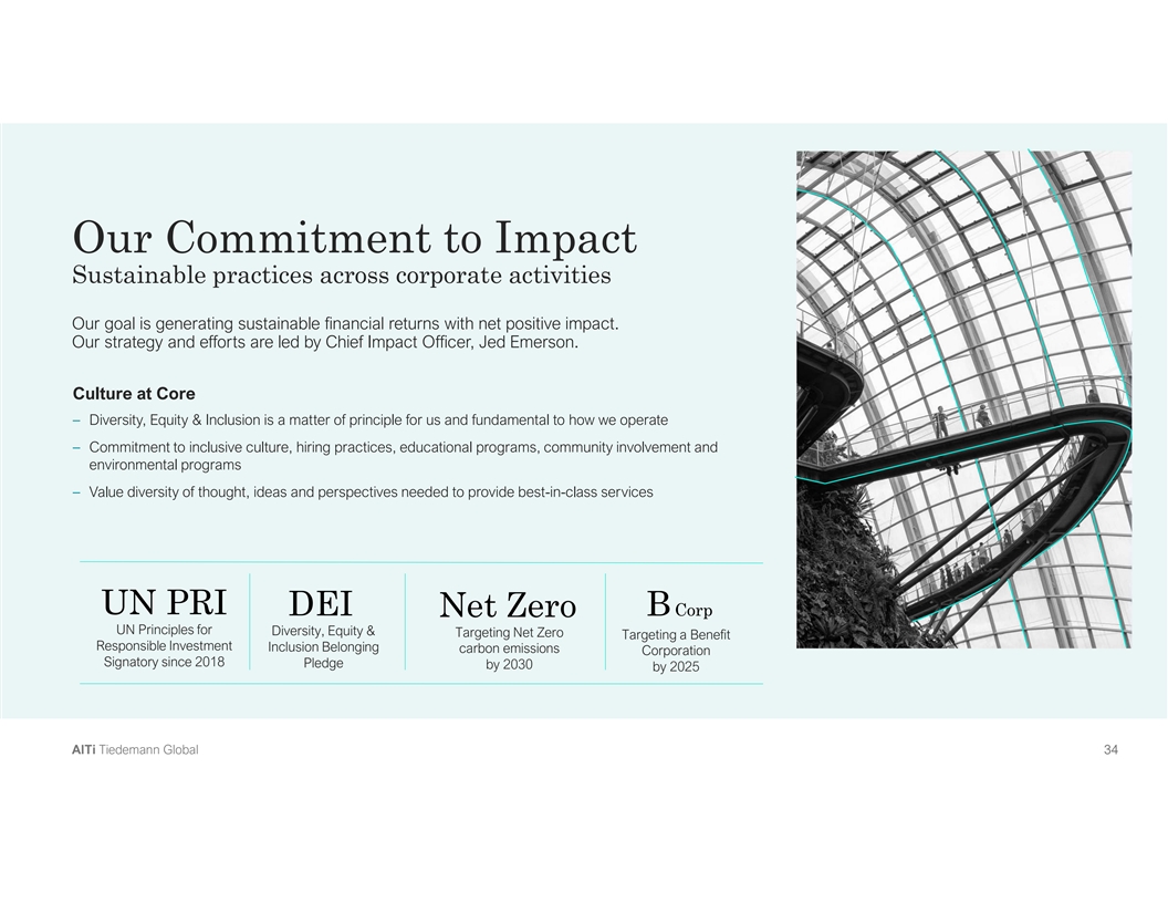 Our Commitment to Impact Sustainable practices across corporate activities Our goal is generating sustainable financial returns with net positive impact. Our strategy and efforts are led by Chief Impact Officer, Jed Emerson. Culture at Core – Diversity, Equity & Inclusion is a matter of principle for us and fundamental to how we operate – Commitment to inclusive culture, hiring practices, educational programs, community involvement and environmental programs – Value diversity of thought, ideas and perspectives needed to provide best-in-class services UN PRI DEI Corp Net Zero B UN Principles for Diversity, Equity & Targeting Net Zero Targeting a Benefit Responsible Investment Inclusion Belonging carbon emissions Corporation Signatory since 2018 Pledge by 2030 by 2025 A Al lT Ti i T Tiie ed de em ma an nn n G Gllo ob ba all 3 34 4