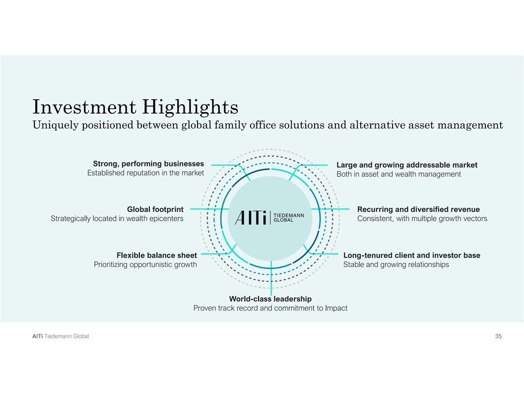 Investment Highlights Uniquely positioned between global family office solutions and alternative asset management Strong, performing businesses Large and growing addressable market Established reputation in the market Both in asset and wealth management Global footprint Recurring and diversified revenue Strategically located in wealth epicenters Consistent, with multiple growth vectors Flexible balance sheet Long-tenured client and investor base Prioritizing opportunistic growth Stable and growing relationships World-class leadership Proven track record and commitment to Impact A Al lT Ti i T Tiie ed de em ma an nn n G Gllo ob ba all 9 9 9