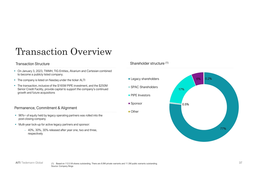 Transaction Overview (1) Shareholder structure Transaction Structure § On January 3, 2023, TWMH, TIG Entities, Alvarium and Cartesian combined to become a publicly listed company. 6% 0.2% Legacy shareholders § The company is listed on Nasdaq under the ticker ALTI § The transaction, inclusive of the $165M PIPE investment, and the $250M SPAC Shareholders Senior Credit Facility, provide capital to support the company’s continued 17% growth and future acquisitions PIPE Investors Sponsor 0.5% Permanence, Commitment & Alignment Other § 96%+ of equity held by legacy operating partners was rolled into the post-closing company § Multi-year lock-up for active legacy partners and sponsor: 77% – 40%, 30%, 30% released after year one, two and three, respectively AlTi Tiedemann Global 37 (1) Based on 112.5 M shares outstanding. There are 8.9M private warrants and 11.5M public warrants outstanding. Source: Company filings