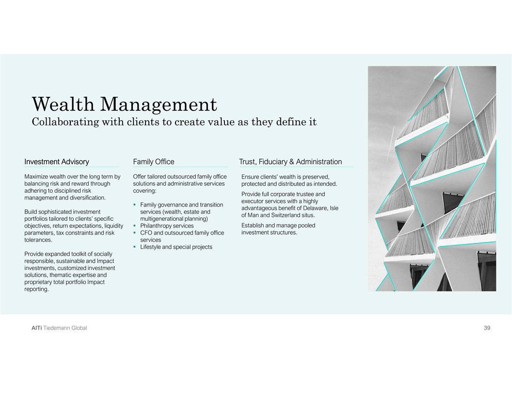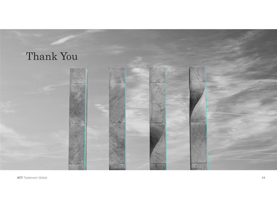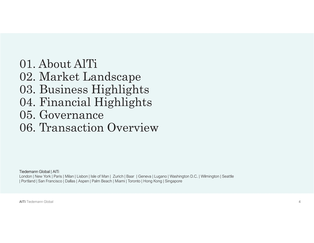 01. About AlTi 02. Market Landscape 03. Business Highlights 04. Financial Highlights 05. Governance 06. Transaction Overview Tiedemann Global | AlTi London | New York | Paris | Milan | Lisbon | Isle of Man | Zurich | Baar | Geneva | Lugano | Washington D.C. | Wilmington | Seattle | Portland | San Francisco | Dallas | Aspen | Palm Beach | Miami | Toronto | Hong Kong | Singapore A Al lT Ti i T Tiie ed de em ma an nn n G Gllo ob ba all 4 4