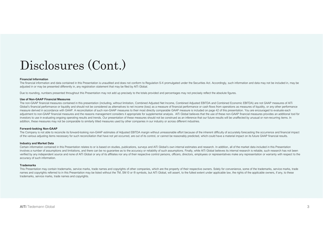 Disclosures This Presentation (together with oral statements made in connection herewith, the “Presentation”) is for informational purposes only to assist interested parties in evaluating AlTi Global, Inc. (along with its consolidated subsidiaries, “AlTi Global” or the Company ). About AlTi Global AlTi Global is a multi-disciplinary financial services business with a diverse array of investment, advisory, and administrative capabilities which serves clients and investors around the globe. The firm manages approximately $65 billion in combined assets and provides holistic solutions for wealth management clients through a full spectrum of services, including discretionary investment management services, non-discretionary investment advisory services, fiduciary and trust services, administration services, new generational wealth planning services and family office services. AlTi Global structures, arranges, and provides a network of investors with co-investment opportunities in a variety of alternative assets which are either managed intra-group or by carefully selected managers with a proven track record in the relevant asset class. AlTi Global operates globally, with approximately 470 professionals operating in 22 cities in 10 countries across four continents. No Offer or Solicitation This Presentation does not constitute an offer to sell, a solicitation of an offer to buy, or a recommendation to purchase any equity, debt or other financial instruments of AlTi Global. The information contained herein does not purport to be all-inclusive and none of AlTi Global nor any of its respective subsidiaries, stockholders, affiliates, representatives, control persons, partners, members, managers, directors, officers, employees, advisers or agents make any representation or warranty, express or implied, as to the accuracy, completeness or reliability of the information contained in this Presentation. Prospective investors should consult with their own counsel and tax and financial advisors as to legal and related matters concerning the matters described herein, and, by accepting this Presentation, you confirm that you are not relying solely upon the information contained herein to make any investment decision. The recipient shall not rely upon any statement, representation or warranty made by any other person, firm or corporation in making its investment decision to subscribe for securities of AlTi Global. To the fullest extent permitted by law, in no circumstances will AlTi Global or any of its subsidiaries, stockholders, affiliates, representatives, control persons, partners, members, managers, directors, officers, employees, advisers or agents be responsible or liable for any direct, indirect or consequential loss or loss of profit arising from the use of this Presentation, its contents, its omissions, reliance on the information contained within it, or on opinions communicated in relation thereto or otherwise arising in connection therewith. In addition, this Presentation does not purport to be all-inclusive or to contain all of the information that may be required to make a full analysis of AlTi Global. The general explanations included in this Presentation cannot address, and are not intended to address, your specific investment objectives, financial situations or financial needs. Forward-Looking Statements Some of the statements in this presentation may constitute “forward-looking statements” within the meaning of Section 27A of the Securities Act of 1933 (the “Securities Act”), Section 21E of the Securities Exchange Act of 1934 and the Private Securities Litigation Reform Act of 1995. All statements other than statements of historical fact are forward-looking. Words such as “anticipate,” “believe,” “continue,” “estimate,” “expect,” “future,” “intend,” “may,” “plan” and “will” and similar expressions identify forward-looking statements. Forward-looking statements reflect management’s current plans, estimates and expectations and are inherently uncertain. The inclusion of any forward- looking information in this presentation should not be regarded as a representation that the future plans, estimates or expectations contemplated will be achieved. Forward-looking statements are subject to various risks, uncertainties and assumptions. Important factors that could cause actual results to differ materially from those in forward-looking statements include, but are not limited to, global and domestic market and business conditions, successful execution of business and growth strategies and regulatory factors relevant to our business, as well as assumptions relating to our operations, financial results, financial condition, business prospects, growth strategy and liquidity and the risks and uncertainties described in greater detail under “Risk Factors” included in AlTi Global's registration statement on Form 10-K filed April 17, 2023, and in the subsequent reports filed with the Securities and Exchange Commission, as such factors may be updated from time to time. We undertake no obligation to revise or update any forward-looking statements, whether as a result of new information, future events or otherwise, except as may be required by law. A Al lT Ti i T Tiie ed de em ma an nn n G Gllo ob ba all 2 2