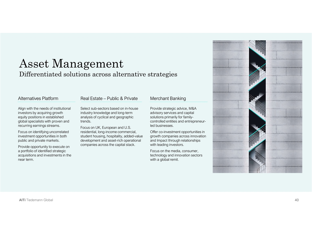 Asset Management Differentiated solutions across alternative strategies Alternatives Platform Real Estate – Public & Private Merchant Banking Align with the needs of institutional Select sub-sectors based on in-house Provide strategic advice, M&A investors by acquiring growth industry knowledge and long-term advisory services and capital equity positions in established analysis of cyclical and geographic solutions primarily for family- global specialists with proven and trends. controlled entities and entrepreneur- recurring earnings streams. led businesses. Focus on UK, European and U.S. Focus on identifying uncorrelated residential, long-income commercial, Offer co-investment opportunities in investment opportunities in both student housing, hospitality, added-value growth companies across innovation public and private markets. development and asset-rich operational and Impact through relationships companies across the capital stack. with leading investors. Provide opportunity to execute on a portfolio of identified strategic Focus on the media, consumer, acquisitions and investments in the technology and innovation sectors near term. with a global remit. A Al lT Ti i T Tiie ed de em ma an nn n G Gllo ob ba all 4 4 40 0 0