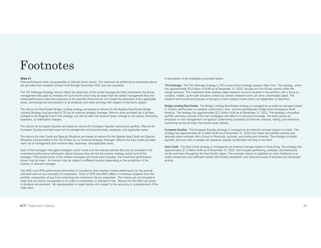 Footnotes Slide 21 A description of the strategies is provided below: Past performance does not guarantee or indicate future results. The historical net performance presented above are provided from inception of each fund through December 2022 and are unaudited. TIG Arbitrage: The TIG Arbitrage strategy is TIG’s event-driven strategy based in New York. This strategy, which has approximately $3.0 billion of AUM as of December 31, 2022, focuses on 0-to-30-day events within the The TIG Arbitrage Strategy returns reflect the deduction of the actual management fees (represents the actual merger process. The investment team employs deep research on each situation in the portfolio with a focus on management fees paid by investors for such month which may be lower than the stated management fee) and complex, hostile, up-for-sale situations where our primary research work can drive uncorrelated alpha. The stated performance fees and expenses at the specified times but do not include the deduction of any applicable research and investment process is focused on hard catalyst events and is not dependent on deal flow. taxes, and include the reinvestment of all dividends and other earnings with respect to the fund’s assets. Bridge Lending Real Estate: The Bridge Lending Real Estate strategy is managed by an external manager based The returns for Real Estate Bridge Lending strategy are based on returns for the flagship Real Estate Bridge in Toronto and focuses on complex construction, term, and pre-development bridge loans throughout North Lending Strategy fund provided to TIG by an external strategic manager. Returns were provided net of all fees America. The strategy has approximately $2.2 billion AUM as of December 31, 2022. The strategy’s diversified charged to the flagship fund in this strategy, but did not take into account taxes, change in unit values, third-party portfolio primarily consists of first lien mortgages with little to no structural leverage. The team places an expenses, or redemption charges. emphasis on risk management via rigorous underwriting consisting of borrower analysis, vetting, and extensive monitoring across all major real estate asset classes. The returns for European Equities are based on returns for European Equities’ benchmark portfolio. Returns for European Equities provided were net of management and incentive fees, expenses, and applicable taxes. European Equities: The European Equities strategy is managed by an external manager based in London. The strategy has approximately $1.6 billion AUM as of December 31, 2022 and trades the portfolio actively and The returns for Asia Credit and Special Situations are based on returns for the flagship Asia Credit and Special absolute return-oriented with a focus on financials, cyclicals, and mining and minerals. The strategy is market Situations fund provided to the TIG Entities by our External Strategic Manager. Returns for Asia Credit provided agnostic and runs with a variable net exposure, equally comfortable net long or net short. were net of management and incentive fees, expenses, and applicable taxes. Asia Credit: The Asia Credit strategy is managed by an external manager based in Hong Kong. The strategy has Each of the managers managed strategies and/or funds over the relevant periods that are not included in the approximately $1.5 billion AUM as of December 31, 2022, and includes performing, stressed, and distressed investment performance information above because they are not the primary strategy and/or fund of the bonds and loans throughout the Asia Pacific region. The manager strives to capitalize on what It believes is an manager. If the performance of the omitted strategies and funds were included, the investment performance under-researched and inefficient market with limited competition and attractive levels of stressed and distressed shown may be lower. An investor may be subject to different taxation depending on the jurisdiction of the activity. investor or relevant manager. The MSCI and HFRI performance information is included to show relative market performance for the periods indicated and not as a standard of comparison. Each of HFRI and MSCI differs in numerous respects from the portfolio composition of any fund comprising the investment returns presented. The indices are not included to imply that any fund is comparable to an index in composition or element of risk. Returns for the MSCI are gross of dividend reinvestment. No representation is made hereby with respect to the accuracy or completeness of the index data. A Al lT Ti i T Tiie ed de em ma an nn n G Gllo ob ba all 4 41 1