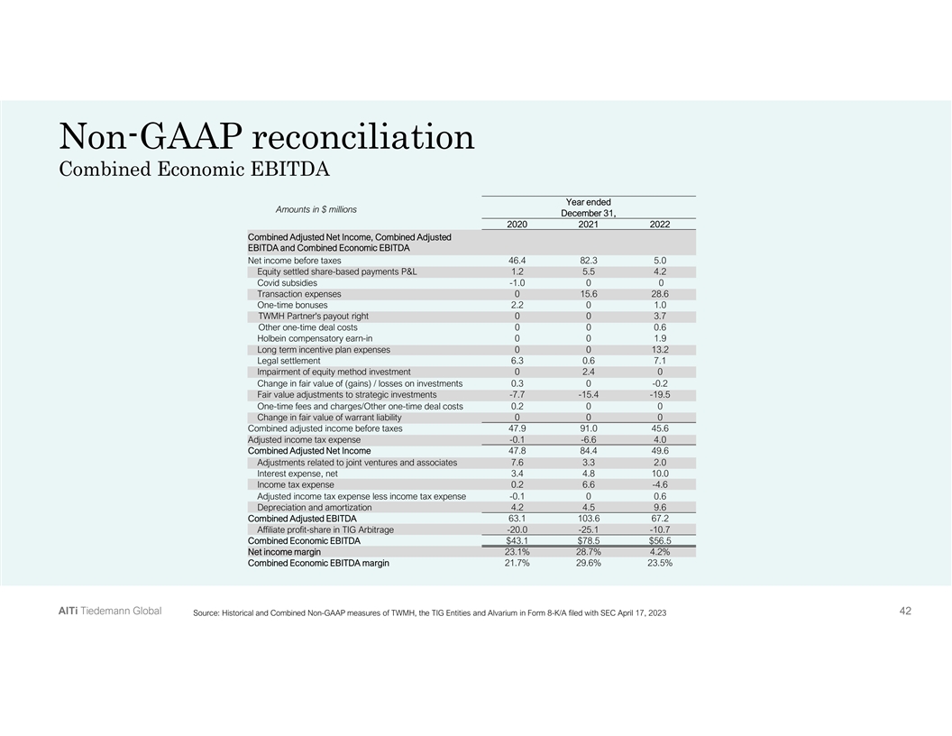 Non-GAAP reconciliation Combined Economic EBITDA Year ended Amounts in $ millions December 31, 2020 2021 2022 Combined Adjusted Net Income, Combined Adjusted EBITDA and Combined Economic EBITDA Net income before taxes 46.4 82.3 5.0 Equity settled share-based payments P&L 1.2 5.5 4.2 Covid subsidies -1.0 0 0 Transaction expenses 0 15.6 28.6 One-time bonuses 2.2 0 1.0 TWMH Partner's payout right 0 0 3.7 Other one-time deal costs 0 0 0.6 Holbein compensatory earn-in 0 0 1.9 Long term incentive plan expenses 0 0 13.2 Legal settlement 6.3 0.6 7.1 Impairment of equity method investment 0 2.4 0 Change in fair value of (gains) / losses on investments 0.3 0 -0.2 Fair value adjustments to strategic investments -7.7 -15.4 -19.5 One-time fees and charges/Other one-time deal costs 0.2 0 0 Change in fair value of warrant liability 0 0 0 Combined adjusted income before taxes 47.9 91.0 45.6 Adjusted income tax expense -0.1 -6.6 4.0 Combined Adjusted Net Income 47.8 84.4 49.6 Adjustments related to joint ventures and associates 7.6 3.3 2.0 Interest expense, net 3.4 4.8 10.0 Income tax expense 0.2 6.6 -4.6 Adjusted income tax expense less income tax expense -0.1 0 0.6 Depreciation and amortization 4.2 4.5 9.6 Combined Adjusted EBITDA 63.1 103.6 67.2 Affiliate profit-share in TIG Arbitrage -20.0 -25.1 -10.7 Combined Economic EBITDA $43.1 $78.5 $56.5 Net income margin 23.1% 28.7% 4.2% Combined Economic EBITDA margin 21.7% 29.6% 23.5% A Al lT Ti i T Tiie ed de em ma an nn n G Gllo ob ba all 4 4 42 2 2 Source: Historical and Combined Non-GAAP measures of TWMH, the TIG Entities and Alvarium in Form 8-K/A filed with SEC April 17, 2023