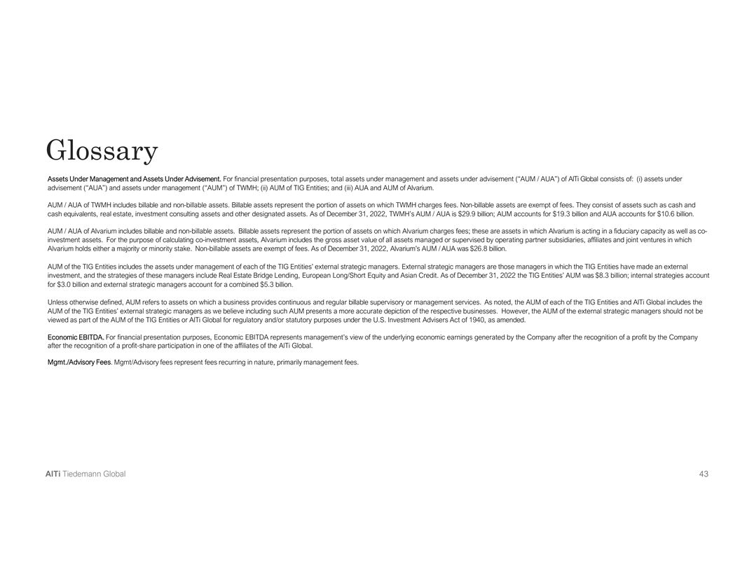 Glossary Assets Under Management and Assets Under Advisement. For financial presentation purposes, total assets under management and assets under advisement (“AUM / AUA”) of AlTi Global consists of: (i) assets under advisement (“AUA”) and assets under management (“AUM”) of TWMH; (ii) AUM of TIG Entities; and (iii) AUA and AUM of Alvarium. AUM / AUA of TWMH includes billable and non-billable assets. Billable assets represent the portion of assets on which TWMH charges fees. Non-billable assets are exempt of fees. They consist of assets such as cash and cash equivalents, real estate, investment consulting assets and other designated assets. As of December 31, 2022, TWMH’s AUM / AUA is $29.9 billion; AUM accounts for $19.3 billion and AUA accounts for $10.6 billion. AUM / AUA of Alvarium includes billable and non-billable assets. Billable assets represent the portion of assets on which Alvarium charges fees; these are assets in which Alvarium is acting in a fiduciary capacity as well as co- investment assets. For the purpose of calculating co-investment assets, Alvarium includes the gross asset value of all assets managed or supervised by operating partner subsidiaries, affiliates and joint ventures in which Alvarium holds either a majority or minority stake. Non-billable assets are exempt of fees. As of December 31, 2022, Alvarium’s AUM / AUA was $26.8 billion. AUM of the TIG Entities includes the assets under management of each of the TIG Entities’ external strategic managers. External strategic managers are those managers in which the TIG Entities have made an external investment, and the strategies of these managers include Real Estate Bridge Lending, European Long/Short Equity and Asian Credit. As of December 31, 2022 the TIG Entities’ AUM was $8.3 billion; internal strategies account for $3.0 billion and external strategic managers account for a combined $5.3 billion. Unless otherwise defined, AUM refers to assets on which a business provides continuous and regular billable supervisory or management services. As noted, the AUM of each of the TIG Entities and AlTi Global includes the AUM of the TIG Entities’ external strategic managers as we believe including such AUM presents a more accurate depiction of the respective businesses. However, the AUM of the external strategic managers should not be viewed as part of the AUM of the TIG Entities or AlTi Global for regulatory and/or statutory purposes under the U.S. Investment Advisers Act of 1940, as amended. Economic EBITDA. For financial presentation purposes, Economic EBITDA represents management’s view of the underlying economic earnings generated by the Company after the recognition of a profit by the Company after the recognition of a profit-share participation in one of the affiliates of the AlTi Global. Mgmt./Advisory Fees. Mgmt/Advisory fees represent fees recurring in nature, primarily management fees. AlTi Tiedemann Global 43