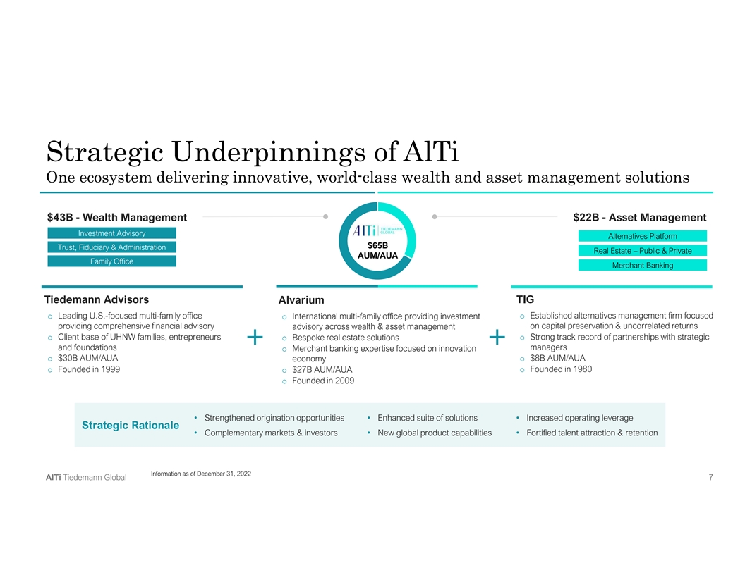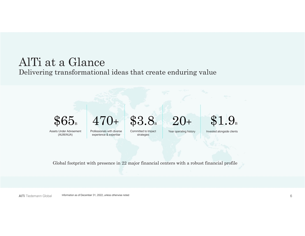 AlTi at a Glance Delivering transformational ideas that create enduring value $1.9B $65B 470+ $3.8B 20+ Assets Under Advisement Professionals with diverse Committed to Impact Year operating history Invested alongside clients (AUM/AUA) experience & expertise strategies Global footprint with presence in 22 major financial centers with a robust financial profile Information as of December 31, 2022, unless otherwise noted A Al lT Ti i T Tiie ed de em ma an nn n G Gllo ob ba all 6 6 6