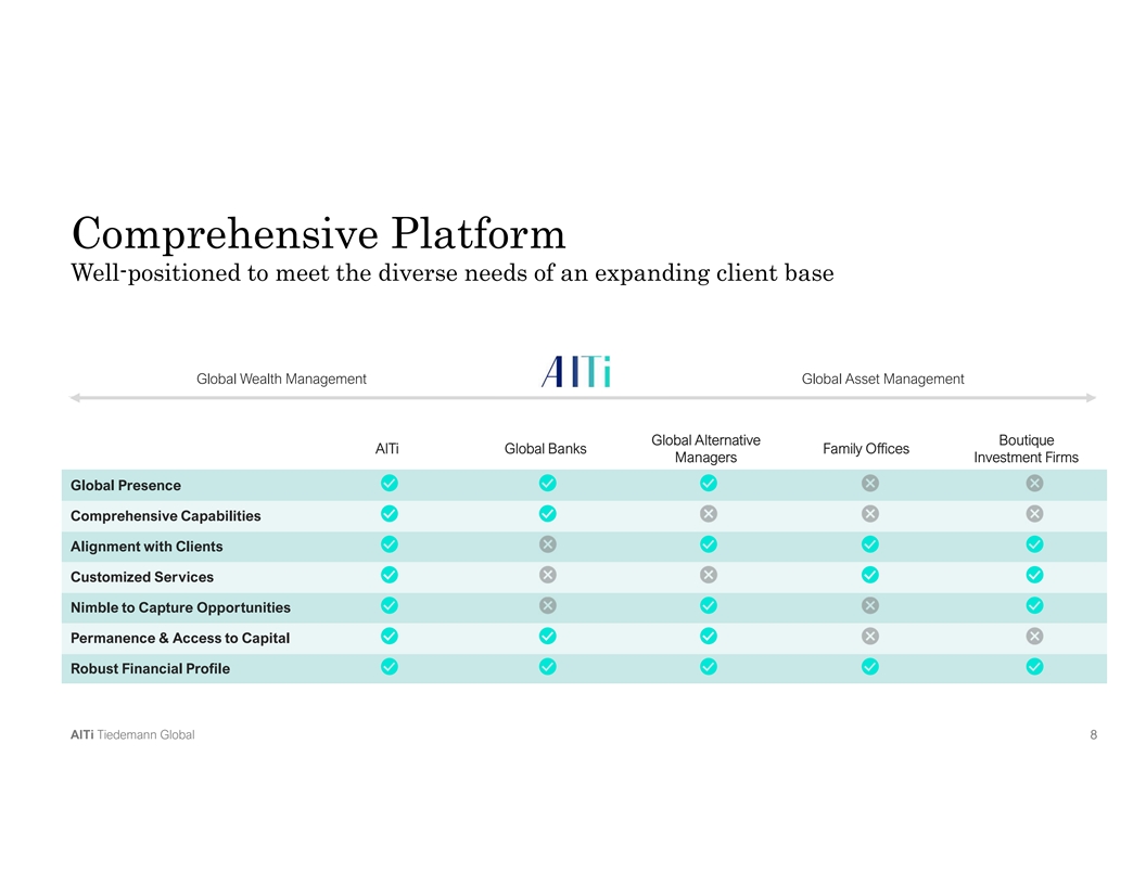 Strategic Underpinnings of AlTi One ecosystem delivering innovative, world-class wealth and asset management solutions $43B - Wealth Management $22B - Asset Management Investment Advisory Alternatives Platform $65B Trust, Fiduciary & Administration Real Estate – Public & Private AUM/AUA Family Office Merchant Banking Tiedemann Advisors Alvarium TIG o Leading U.S.-focused multi-family office o Established alternatives management firm focused o International multi-family office providing investment providing comprehensive financial advisory on capital preservation & uncorrelated returns advisory across wealth & asset management o Client base of UHNW families, entrepreneurs o Bespoke real estate solutions o Strong track record of partnerships with strategic + + and foundations managers o Merchant banking expertise focused on innovation o $30B AUM/AUAo $8B AUM/AUA economy o Founded in 1999o Founded in 1980 o $27B AUM/AUA o Founded in 2009 • Strengthened origination opportunities • Enhanced suite of solutions• Increased operating leverage Strategic Rationale • Complementary markets & investors • New global product capabilities • Fortified talent attraction & retention Information as of December 31, 2022 A Al lT Ti i T Tiie ed de em ma an nn n G Gllo ob ba all 7 7