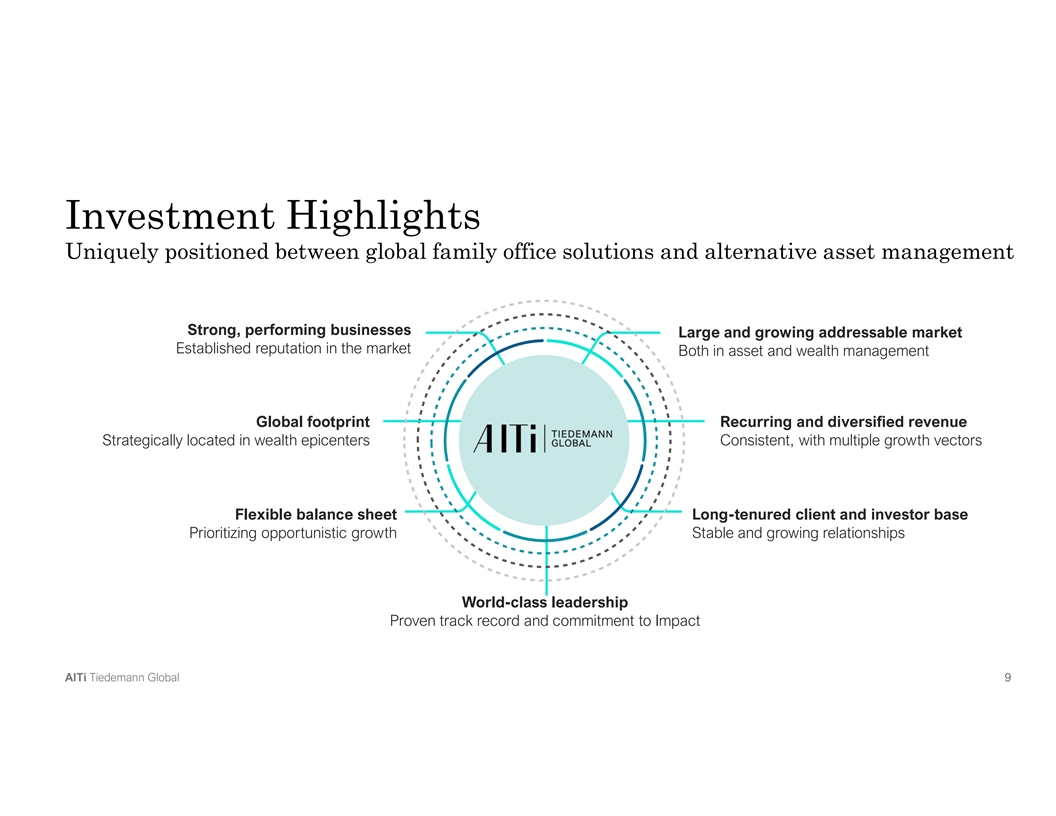 Comprehensive Platform Well-positioned to meet the diverse needs of an expanding client base Global Wealth Management Global Asset Management Global Alternative Boutique AlTi Global Banks Family Offices Managers Investment Firms Global Presence Comprehensive Capabilities Alignment with Clients Customized Services Nimble to Capture Opportunities Permanence & Access to Capital Robust Financial Profile AlTi Tiedemann Global 8