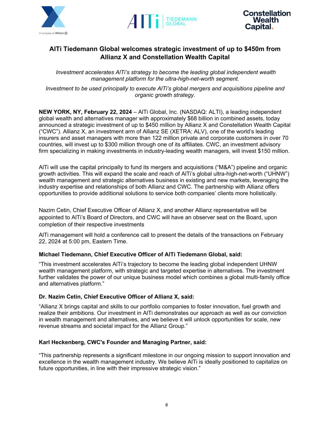 AlTi Tiedemann Global welcomes strategic investment of up to $450m from Allianz X and Constellation Wealth Capital Investment accelerates AlTi’s strategy to become the leading global independent wealth management platform for the ultra-high-net-worth segment. Investment to be used principally to execute AlTi’s global mergers and acquisitions pipeline and organic growth strategy. NEW YORK, NY, February 22, 2024 – AlTi Global, Inc. (NASDAQ: ALTI), a leading independent global wealth and alternatives manager with approximately $68 billion in combined assets, today announced a strategic investment of up to $450 million by Allianz X and Constellation Wealth Capital (“CWC”). Allianz X, an investment arm of Allianz SE (XETRA: ALV), one of the world’s leading insurers and asset managers with more than 122 million private and corporate customers in over 70 countries, will invest up to $300 million through one of its affiliates. CWC, an investment advisory firm specializing in making investments in industry-leading wealth managers, will invest $150 million. AlTi will use the capital principally to fund its mergers and acquisitions (“M&A”) pipeline and organic growth activities. This will expand the scale and reach of AlTi’s global ultra-high-net-worth (“UHNW”) wealth management and strategic alternatives business in existing and new markets, leveraging the industry expertise and relationships of both Allianz and CWC. The partnership with Allianz offers opportunities to provide additional solutions to service both companies’ clients more holistically. Nazim Cetin, Chief Executive Officer of Allianz X, and another Allianz representative will be appointed to AlTi’s Board of Directors, and CWC will have an observer seat on the Board, upon completion of their respective investments AlTi management will hold a conference call to present the details of the transactions on February 22, 2024 at 5:00 pm, Eastern Time. Michael Tiedemann, Chief Executive Officer of AlTi Tiedemann Global, said: “This investment accelerates AlTi’s trajectory to become the leading global independent UHNW wealth management platform, with strategic and targeted expertise in alternatives. The investment further validates the power of our unique business model which combines a global multi-family office and alternatives platform.” Dr. Nazim Cetin, Chief Executive Officer of Allianz X, said: “Allianz X brings capital and skills to our portfolio companies to foster innovation, fuel growth and realize their ambitions. Our investment in AlTi demonstrates our approach as well as our conviction in wealth management and alternatives, and we believe it will unlock opportunities for scale, new revenue streams and societal impact for the Allianz Group.” Karl Heckenberg, CWC's Founder and Managing Partner, said: “This partnership represents a significant milestone in our ongoing mission to support innovation and excellence in the wealth management industry. We believe AlTi is ideally positioned to capitalize on future opportunities, in line with their impressive strategic vision.”