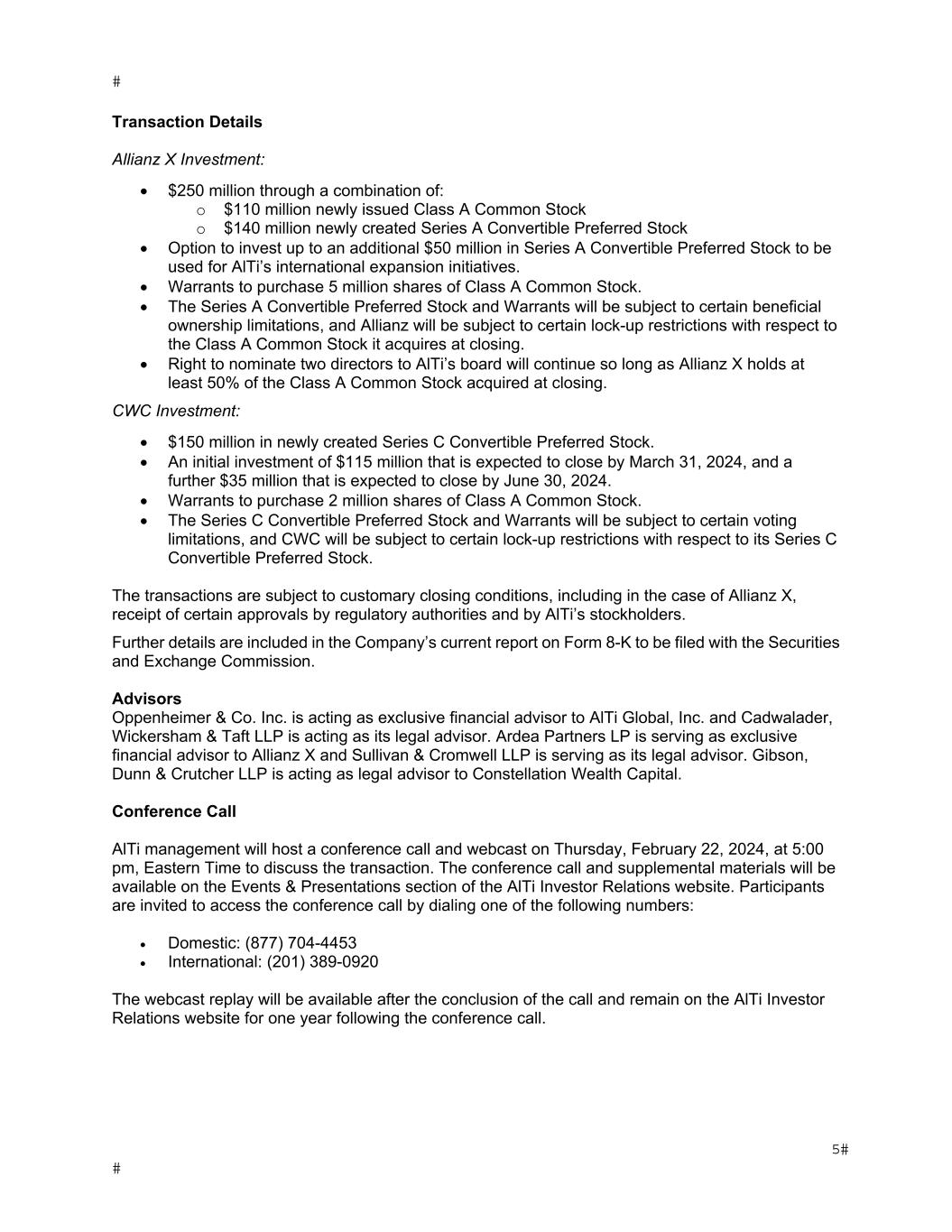 Transaction Details Allianz X Investment:  $250 million through a combination of: o $110 million newly issued Class A Common Stock o $140 million newly created Series A Convertible Preferred Stock  Option to invest up to an additional $50 million in Series A Convertible Preferred Stock to be used for AlTi’s international expansion initiatives.  Warrants to purchase 5 million shares of Class A Common Stock.  The Series A Convertible Preferred Stock and Warrants will be subject to certain beneficial ownership limitations, and Allianz will be subject to certain lock-up restrictions with respect to the Class A Common Stock it acquires at closing.  Right to nominate two directors to AlTi’s board will continue so long as Allianz X holds at least 50% of the Class A Common Stock acquired at closing. CWC Investment:  $150 million in newly created Series C Convertible Preferred Stock.  An initial investment of $115 million that is expected to close by March 31, 2024, and a further $35 million that is expected to close by June 30, 2024.  Warrants to purchase 2 million shares of Class A Common Stock.  The Series C Convertible Preferred Stock and Warrants will be subject to certain voting limitations, and CWC will be subject to certain lock-up restrictions with respect to its Series C Convertible Preferred Stock. The transactions are subject to customary closing conditions, including in the case of Allianz X, receipt of certain approvals by regulatory authorities and by AlTi’s stockholders. Further details are included in the Company’s current report on Form 8-K to be filed with the Securities and Exchange Commission. Advisors Oppenheimer & Co. Inc. is acting as exclusive financial advisor to AlTi Global, Inc. and Cadwalader, Wickersham & Taft LLP is acting as its legal advisor. Ardea Partners LP is serving as exclusive financial advisor to Allianz X and Sullivan & Cromwell LLP is serving as its legal advisor. Gibson, Dunn & Crutcher LLP is acting as legal advisor to Constellation Wealth Capital. Conference Call AlTi management will host a conference call and webcast on Thursday, February 22, 2024, at 5:00 pm, Eastern Time to discuss the transaction. The conference call and supplemental materials will be available on the Events & Presentations section of the AlTi Investor Relations website. Participants are invited to access the conference call by dialing one of the following numbers:  Domestic: (877) 704-4453  International: (201) 389-0920 The webcast replay will be available after the conclusion of the call and remain on the AlTi Investor Relations website for one year following the conference call.