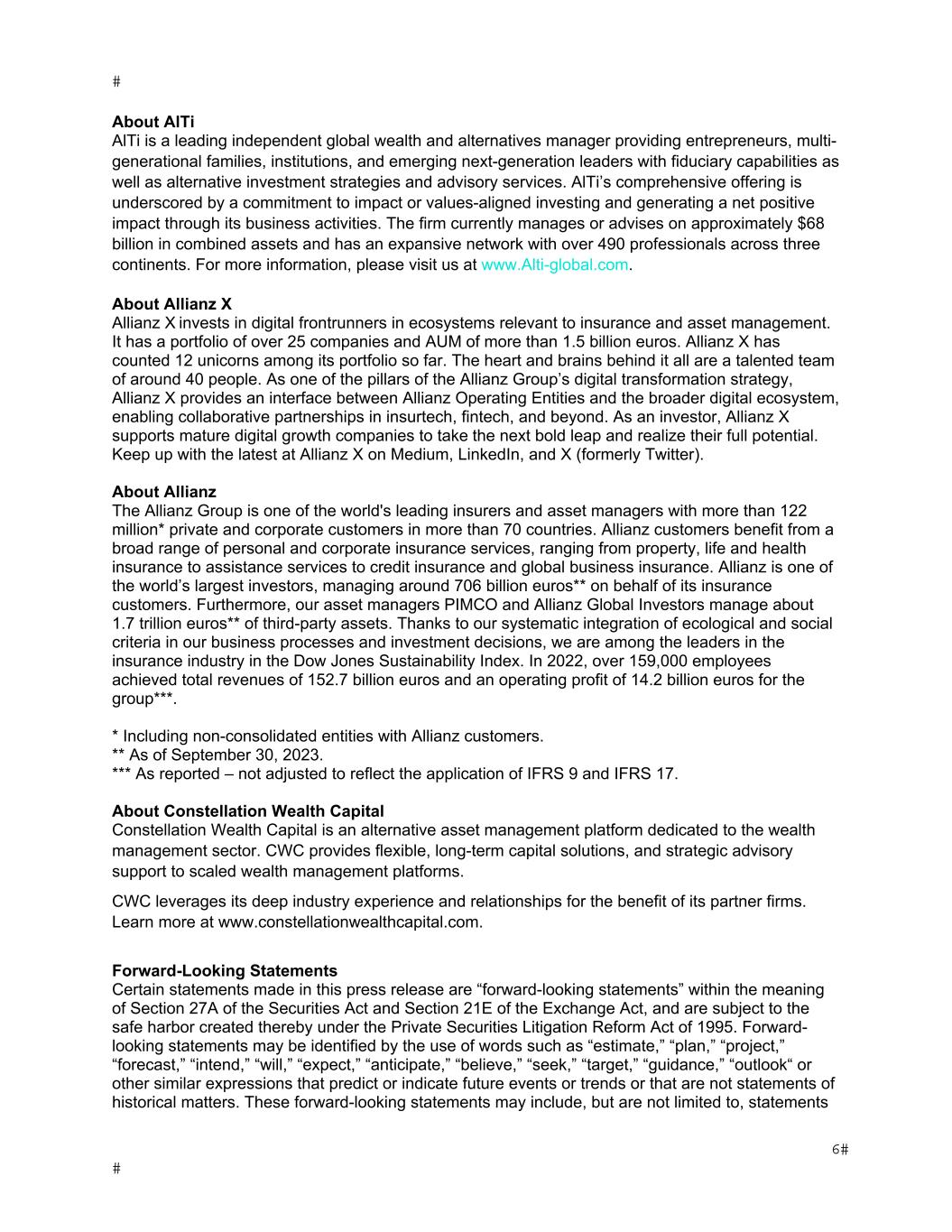 About AlTi AlTi is a leading independent global wealth and alternatives manager providing entrepreneurs, multi- generational families, institutions, and emerging next-generation leaders with fiduciary capabilities as well as alternative investment strategies and advisory services. AlTi’s comprehensive offering is underscored by a commitment to impact or values-aligned investing and generating a net positive impact through its business activities. The firm currently manages or advises on approximately $68 billion in combined assets and has an expansive network with over 490 professionals across three continents. For more information, please visit us at www.Alti-global.com. About Allianz X Allianz X invests in digital frontrunners in ecosystems relevant to insurance and asset management. It has a portfolio of over 25 companies and AUM of more than 1.5 billion euros. Allianz X has counted 12 unicorns among its portfolio so far. The heart and brains behind it all are a talented team of around 40 people. As one of the pillars of the Allianz Group’s digital transformation strategy, Allianz X provides an interface between Allianz Operating Entities and the broader digital ecosystem, enabling collaborative partnerships in insurtech, fintech, and beyond. As an investor, Allianz X supports mature digital growth companies to take the next bold leap and realize their full potential. Keep up with the latest at Allianz X on Medium, LinkedIn, and X (formerly Twitter). About Allianz The Allianz Group is one of the world's leading insurers and asset managers with more than 122 million* private and corporate customers in more than 70 countries. Allianz customers benefit from a broad range of personal and corporate insurance services, ranging from property, life and health insurance to assistance services to credit insurance and global business insurance. Allianz is one of the world’s largest investors, managing around 706 billion euros** on behalf of its insurance customers. Furthermore, our asset managers PIMCO and Allianz Global Investors manage about 1.7 trillion euros** of third-party assets. Thanks to our systematic integration of ecological and social criteria in our business processes and investment decisions, we are among the leaders in the insurance industry in the Dow Jones Sustainability Index. In 2022, over 159,000 employees achieved total revenues of 152.7 billion euros and an operating profit of 14.2 billion euros for the group***. * Including non-consolidated entities with Allianz customers. ** As of September 30, 2023. *** As reported – not adjusted to reflect the application of IFRS 9 and IFRS 17. About Constellation Wealth Capital Constellation Wealth Capital is an alternative asset management platform dedicated to the wealth management sector. CWC provides flexible, long-term capital solutions, and strategic advisory support to scaled wealth management platforms. CWC leverages its deep industry experience and relationships for the benefit of its partner firms. Learn more at www.constellationwealthcapital.com. Forward-Looking Statements Certain statements made in this press release are “forward-looking statements” within the meaning of Section 27A of the Securities Act and Section 21E of the Exchange Act, and are subject to the safe harbor created thereby under the Private Securities Litigation Reform Act of 1995. Forward- looking statements may be identified by the use of words such as “estimate,” “plan,” “project,” “forecast,” “intend,” “will,” “expect,” “anticipate,” “believe,” “seek,” “target,” “guidance,” “outlook“ or other similar expressions that predict or indicate future events or trends or that are not statements of historical matters. These forward-looking statements may include, but are not limited to, statements