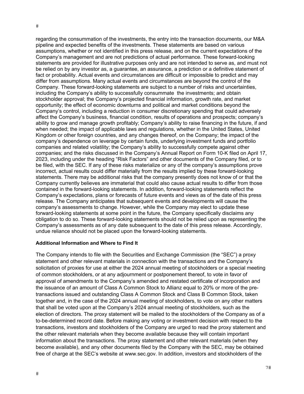 regarding the consummation of the investments, the entry into the transaction documents, our M&A pipeline and expected benefits of the investments. These statements are based on various assumptions, whether or not identified in this press release, and on the current expectations of the Company’s management and are not predictions of actual performance. These forward-looking statements are provided for illustrative purposes only and are not intended to serve as, and must not be relied on by any investor as, a guarantee, an assurance, a prediction or a definitive statement of fact or probability. Actual events and circumstances are difficult or impossible to predict and may differ from assumptions. Many actual events and circumstances are beyond the control of the Company. These forward-looking statements are subject to a number of risks and uncertainties, including the Company’s ability to successfully consummate the investments; and obtain stockholder approval; the Company’s projected financial information, growth rate, and market opportunity; the effect of economic downturns and political and market conditions beyond the Company’s control, including a reduction in consumer discretionary spending that could adversely affect the Company’s business, financial condition, results of operations and prospects; company’s ability to grow and manage growth profitably; Company’s ability to raise financing in the future, if and when needed; the impact of applicable laws and regulations, whether in the United States, United Kingdom or other foreign countries, and any changes thereof, on the Company; the impact of the company’s dependence on leverage by certain funds, underlying investment funds and portfolio companies and related volatility; the Company’s ability to successfully compete against other companies; and the risks discussed in the Company’s Annual Report on Form 10-K filed on April 17, 2023, including under the heading “Risk Factors” and other documents of the Company filed, or to be filed, with the SEC. If any of these risks materialize or any of the company’s assumptions prove incorrect, actual results could differ materially from the results implied by these forward-looking statements. There may be additional risks that the company presently does not know of or that the Company currently believes are immaterial that could also cause actual results to differ from those contained in the forward-looking statements. In addition, forward-looking statements reflect the Company’s expectations, plans or forecasts of future events and views as of the date of this press release. The Company anticipates that subsequent events and developments will cause the company’s assessments to change. However, while the Company may elect to update these forward-looking statements at some point in the future, the Company specifically disclaims any obligation to do so. These forward-looking statements should not be relied upon as representing the Company’s assessments as of any date subsequent to the date of this press release. Accordingly, undue reliance should not be placed upon the forward-looking statements. Additional Information and Where to Find It The Company intends to file with the Securities and Exchange Commission (the “SEC”) a proxy statement and other relevant materials in connection with the transactions and the Company’s solicitation of proxies for use at either the 2024 annual meeting of stockholders or a special meeting of common stockholders, or at any adjournment or postponement thereof, to vote in favor of approval of amendments to the Company’s amended and restated certificate of incorporation and the issuance of an amount of Class A Common Stock to Allianz equal to 20% or more of the pre- transactions issued and outstanding Class A Common Stock and Class B Common Stock, taken together and, in the case of the 2024 annual meeting of stockholders, to vote on any other matters that shall be voted upon at the Company’s 2024 annual meeting of stockholders, such as the election of directors. The proxy statement will be mailed to the stockholders of the Company as of a to-be-determined record date. Before making any voting or investment decision with respect to the transactions, investors and stockholders of the Company are urged to read the proxy statement and the other relevant materials when they become available because they will contain important information about the transactions. The proxy statement and other relevant materials (when they become available), and any other documents filed by the Company with the SEC, may be obtained free of charge at the SEC’s website at www.sec.gov. In addition, investors and stockholders of the