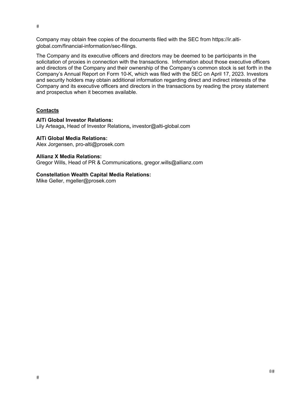 Company may obtain free copies of the documents filed with the SEC from https://ir.alti- global.com/financial-information/sec-filings. The Company and its executive officers and directors may be deemed to be participants in the solicitation of proxies in connection with the transactions. Information about those executive officers and directors of the Company and their ownership of the Company’s common stock is set forth in the Company’s Annual Report on Form 10-K, which was filed with the SEC on April 17, 2023. Investors and security holders may obtain additional information regarding direct and indirect interests of the Company and its executive officers and directors in the transactions by reading the proxy statement and prospectus when it becomes available. Contacts AlTi Global Investor Relations: Lily Arteaga, Head of Investor Relations, investor@alti-global.com AlTi Global Media Relations: Alex Jorgensen, pro-alti@prosek.com Allianz X Media Relations: Gregor Wills, Head of PR & Communications, gregor.wills@allianz.com Constellation Wealth Capital Media Relations: Mike Geller, mgeller@prosek.com