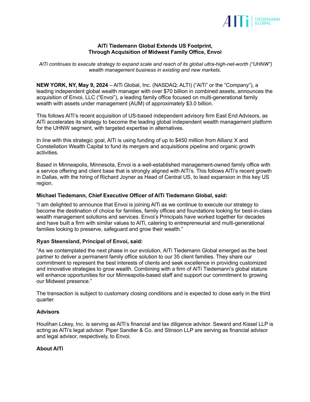 AlTi Tiedemann Global Extends US Footprint, Through Acquisition of Midwest Family Office, Envoi AlTi continues to execute strategy to expand scale and reach of its global ultra-high-net-worth (“UHNW”) wealth management business in existing and new markets. NEW YORK, NY, May 9, 2024 – AlTi Global, Inc. (NASDAQ: ALTI) (“AlTi” or the “Company”), a leading independent global wealth manager with over $70 billion in combined assets, announces the acquisition of Envoi, LLC (“Envoi”), a leading family office focused on multi-generational family wealth with assets under management (AUM) of approximately $3.0 billion. This follows AlTi’s recent acquisition of US-based independent advisory firm East End Advisors, as AlTi accelerates its strategy to become the leading global independent wealth management platform for the UHNW segment, with targeted expertise in alternatives. In line with this strategic goal, AlTi is using funding of up to $450 million from Allianz X and Constellation Wealth Capital to fund its mergers and acquisitions pipeline and organic growth activities. Based in Minneapolis, Minnesota, Envoi is a well-established management-owned family office with a service offering and client base that is strongly aligned with AlTi’s. This follows AlTi’s recent growth in Dallas, with the hiring of Richard Joyner as Head of Central US, to lead expansion in this key US region. Michael Tiedemann, Chief Executive Officer of AlTi Tiedemann Global, said: “I am delighted to announce that Envoi is joining AlTi as we continue to execute our strategy to become the destination of choice for families, family offices and foundations looking for best-in-class wealth management solutions and services. Envoi’s Principals have worked together for decades and have built a firm with similar values to AlTi, catering to entrepreneurial and multi-generational families looking to preserve, safeguard and grow their wealth.” Ryan Steensland, Principal of Envoi, said: “As we contemplated the next phase in our evolution, AlTi Tiedemann Global emerged as the best partner to deliver a permanent family office solution to our 35 client families. They share our commitment to represent the best interests of clients and seek excellence in providing customized and innovative strategies to grow wealth. Combining with a firm of AlTi Tiedemann’s global stature will enhance opportunities for our Minneapolis-based staff and support our commitment to growing our Midwest presence.” The transaction is subject to customary closing conditions and is expected to close early in the third quarter. Advisors Houlihan Lokey, Inc. is serving as AlTi’s financial and tax diligence advisor. Seward and Kissel LLP is acting as AlTi’s legal advisor. Piper Sandler & Co. and Stinson LLP are serving as financial advisor and legal advisor, respectively, to Envoi. About AlTi