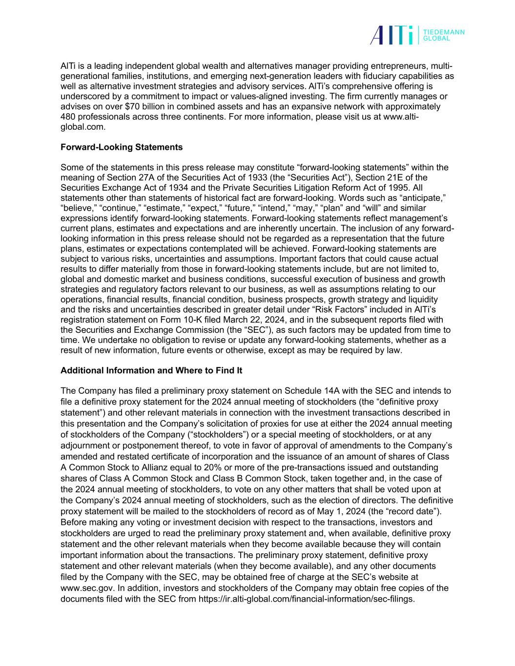 AlTi is a leading independent global wealth and alternatives manager providing entrepreneurs, multi- generational families, institutions, and emerging next-generation leaders with fiduciary capabilities as well as alternative investment strategies and advisory services. AlTi’s comprehensive offering is underscored by a commitment to impact or values-aligned investing. The firm currently manages or advises on over $70 billion in combined assets and has an expansive network with approximately 480 professionals across three continents. For more information, please visit us at www.alti- global.com. Forward-Looking Statements Some of the statements in this press release may constitute “forward-looking statements” within the meaning of Section 27A of the Securities Act of 1933 (the “Securities Act”), Section 21E of the Securities Exchange Act of 1934 and the Private Securities Litigation Reform Act of 1995. All statements other than statements of historical fact are forward-looking. Words such as “anticipate,” “believe,” “continue,” “estimate,” “expect,” “future,” “intend,” “may,” “plan” and “will” and similar expressions identify forward-looking statements. Forward-looking statements reflect management’s current plans, estimates and expectations and are inherently uncertain. The inclusion of any forward- looking information in this press release should not be regarded as a representation that the future plans, estimates or expectations contemplated will be achieved. Forward-looking statements are subject to various risks, uncertainties and assumptions. Important factors that could cause actual results to differ materially from those in forward-looking statements include, but are not limited to, global and domestic market and business conditions, successful execution of business and growth strategies and regulatory factors relevant to our business, as well as assumptions relating to our operations, financial results, financial condition, business prospects, growth strategy and liquidity and the risks and uncertainties described in greater detail under “Risk Factors” included in AlTi’s registration statement on Form 10-K filed March 22, 2024, and in the subsequent reports filed with the Securities and Exchange Commission (the “SEC”), as such factors may be updated from time to time. We undertake no obligation to revise or update any forward-looking statements, whether as a result of new information, future events or otherwise, except as may be required by law. Additional Information and Where to Find It The Company has filed a preliminary proxy statement on Schedule 14A with the SEC and intends to file a definitive proxy statement for the 2024 annual meeting of stockholders (the “definitive proxy statement”) and other relevant materials in connection with the investment transactions described in this presentation and the Company’s solicitation of proxies for use at either the 2024 annual meeting of stockholders of the Company (“stockholders”) or a special meeting of stockholders, or at any adjournment or postponement thereof, to vote in favor of approval of amendments to the Company’s amended and restated certificate of incorporation and the issuance of an amount of shares of Class A Common Stock to Allianz equal to 20% or more of the pre-transactions issued and outstanding shares of Class A Common Stock and Class B Common Stock, taken together and, in the case of the 2024 annual meeting of stockholders, to vote on any other matters that shall be voted upon at the Company’s 2024 annual meeting of stockholders, such as the election of directors. The definitive proxy statement will be mailed to the stockholders of record as of May 1, 2024 (the “record date”). Before making any voting or investment decision with respect to the transactions, investors and stockholders are urged to read the preliminary proxy statement and, when available, definitive proxy statement and the other relevant materials when they become available because they will contain important information about the transactions. The preliminary proxy statement, definitive proxy statement and other relevant materials (when they become available), and any other documents filed by the Company with the SEC, may be obtained free of charge at the SEC’s website at www.sec.gov. In addition, investors and stockholders of the Company may obtain free copies of the documents filed with the SEC from https://ir.alti-global.com/financial-information/sec-filings.