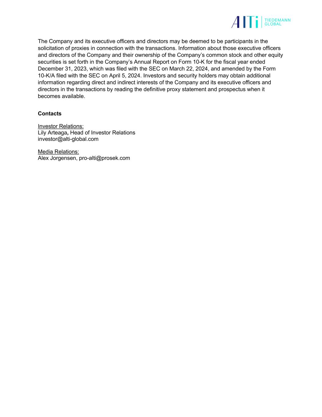 The Company and its executive officers and directors may be deemed to be participants in the solicitation of proxies in connection with the transactions. Information about those executive officers and directors of the Company and their ownership of the Company’s common stock and other equity securities is set forth in the Company’s Annual Report on Form 10-K for the fiscal year ended December 31, 2023, which was filed with the SEC on March 22, 2024, and amended by the Form 10-K/A filed with the SEC on April 5, 2024. Investors and security holders may obtain additional information regarding direct and indirect interests of the Company and its executive officers and directors in the transactions by reading the definitive proxy statement and prospectus when it becomes available. Contacts Investor Relations: Lily Arteaga, Head of Investor Relations investor@alti-global.com Media Relations: Alex Jorgensen, pro-alti@prosek.com